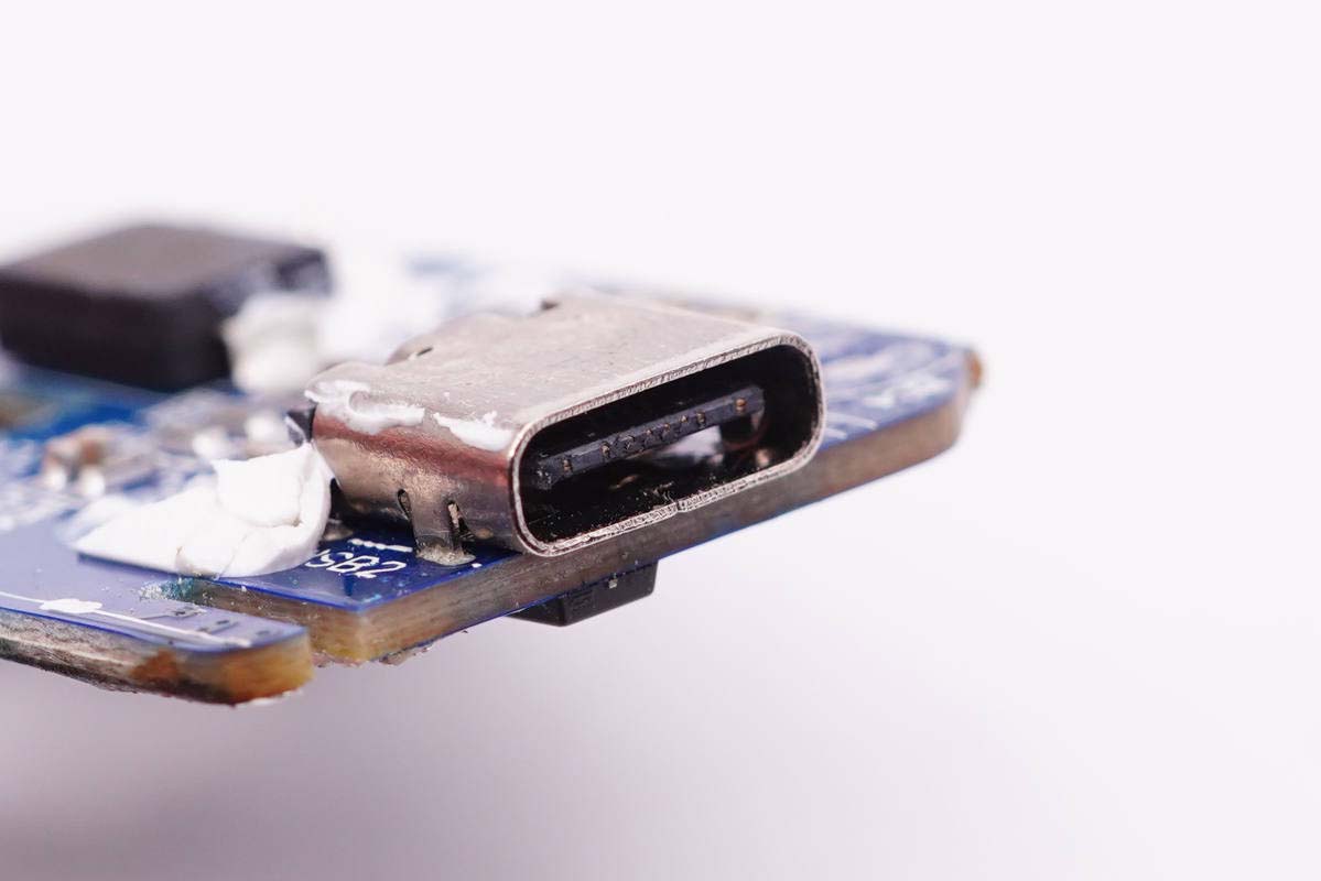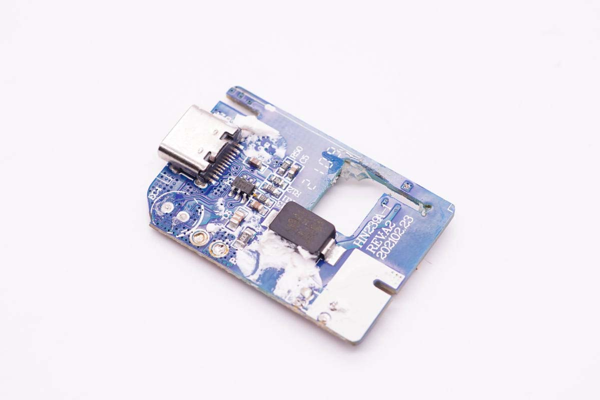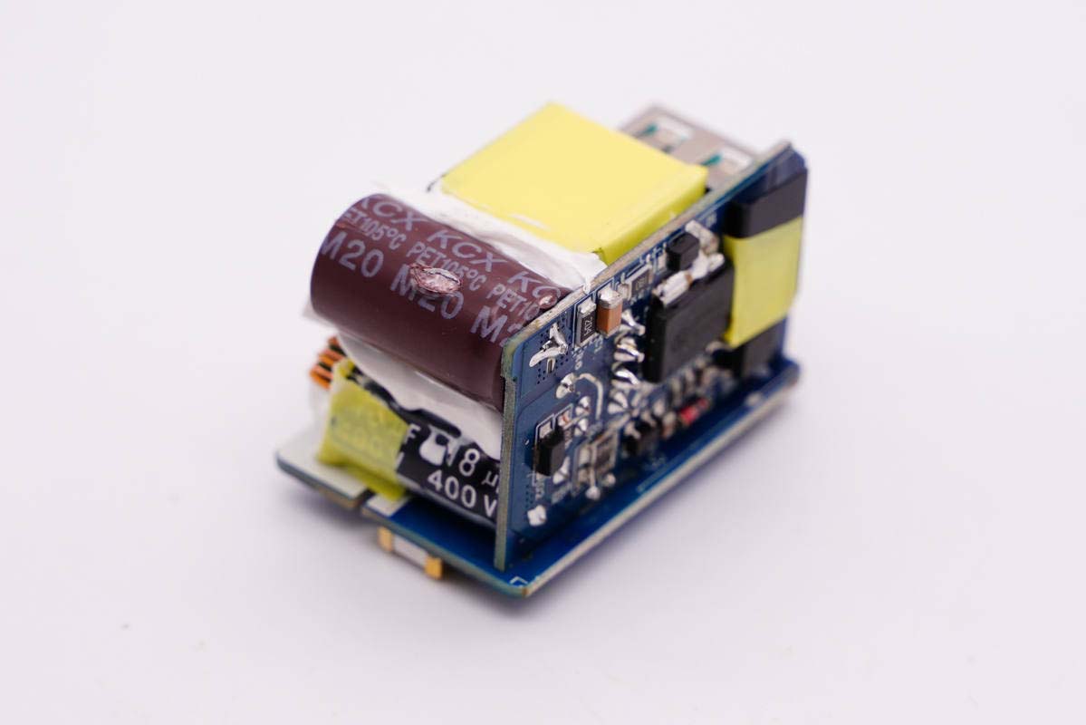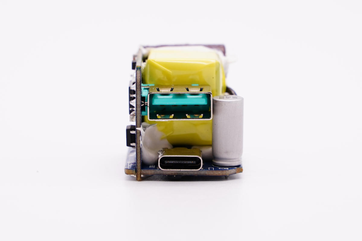 输出端一览,USB-A母座焊接在侧面小板上,右侧是滤波固态电容。