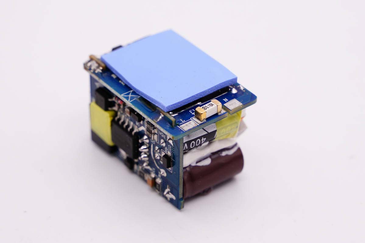将侧面小板拆掉,主板正面还设有贴片Y电容和同步整流控制器。