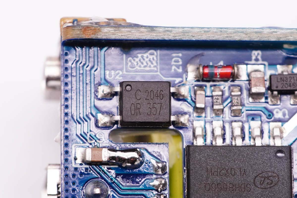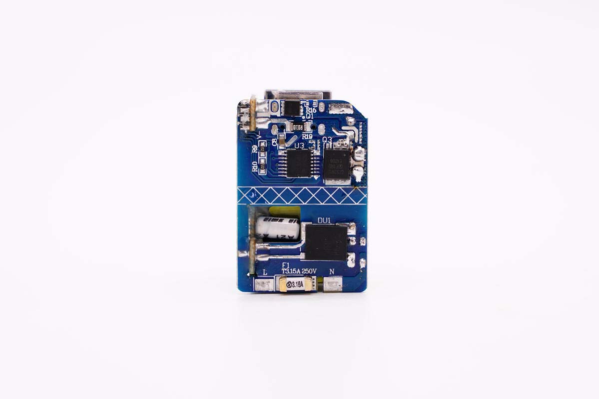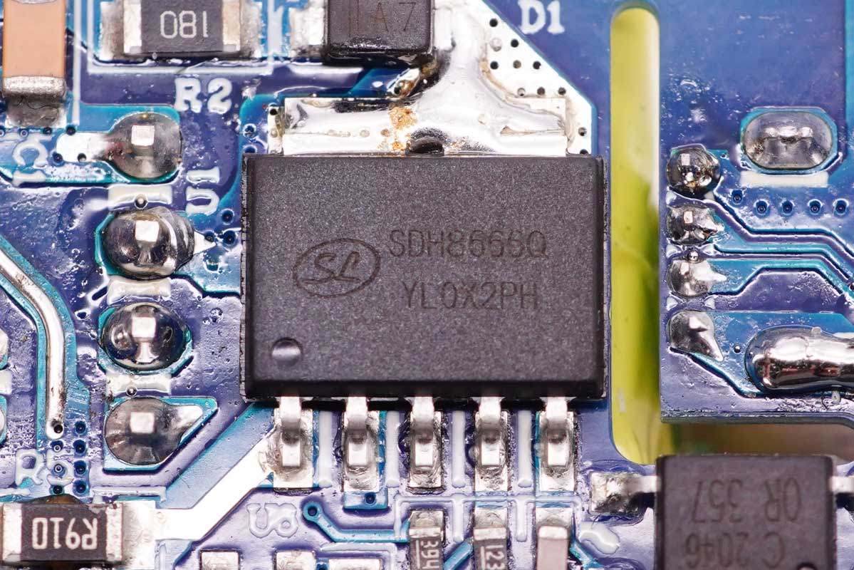 充电器主控芯片采用Silan士兰微SDH8666Q。该系列产品是士兰微电子新一代SSR反激控制芯片,采用了自有专利EHSOP5贴片封装,内置高压大功率MOSFET,导阻0.55Ω,可广泛适用于36W适配器或48W开放环境,包括通用适配器、快充、显示器和平板电视等,此前充电头网已经对该款芯片进行相关报道。