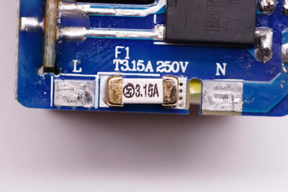 输入端小板背面一览,初级次级分界明显,初级侧设有保险丝、整流桥,主控芯片供电电容对应区域镂空处理,次级侧设有同步整流管、协议芯片以及输出VBUS开关管。
