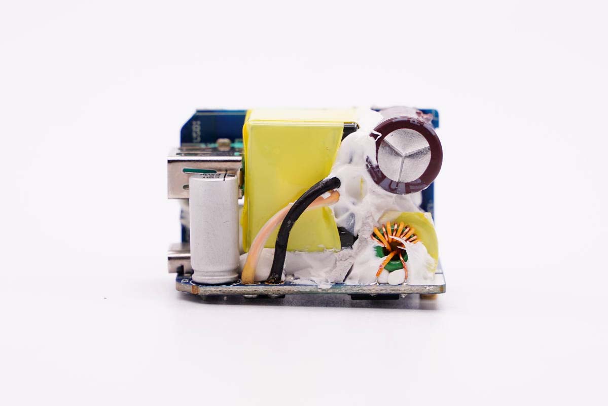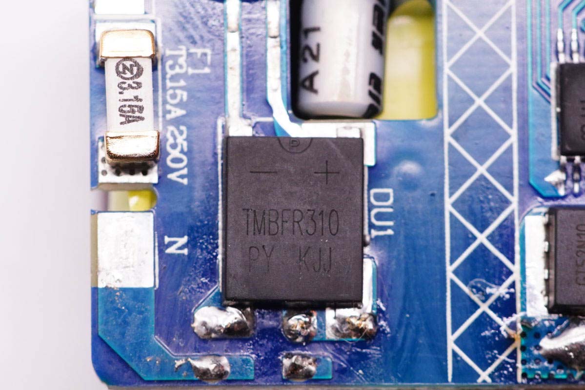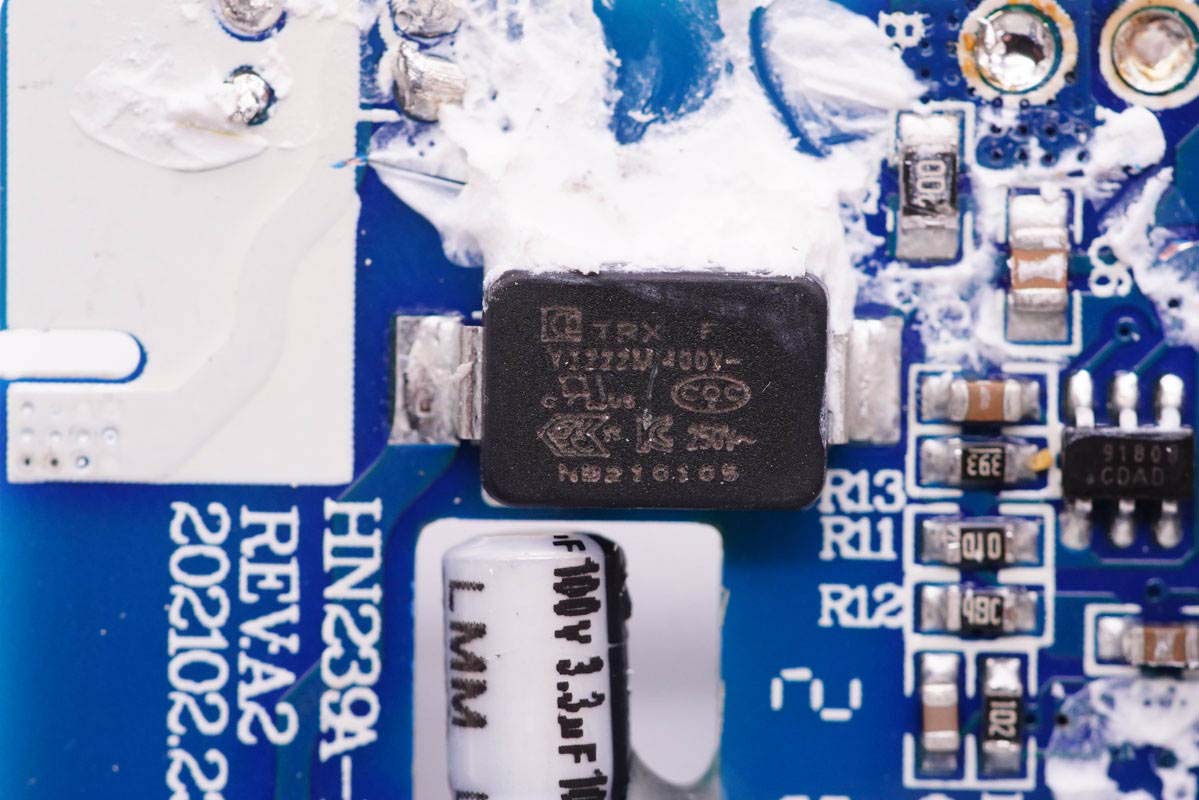 高压滤波电解电容采用永铭KCX系列,这是永铭2019年推出的快充电源专用产品,其工作温度范围在-55℃~105℃,3000小时寿命,并具备抗雷击、低漏电流(低待机功耗)、高纹波电流、高频低阻抗等性能优势。