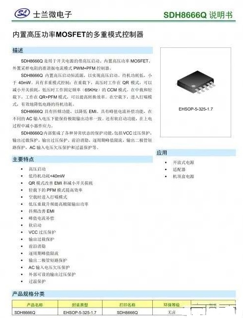 SDH8666Q详细参数资料,采用该芯片的产品还有柚比18W PD快充、麦多多30W 1A1C USB PD快充充电器、万魔双口30W PD快充充电器。此外采用士兰快充产品的还有倍思、belkin、vivo、努比亚、小米等品牌的数十款产品。