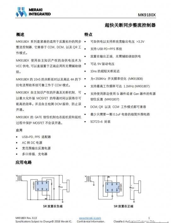 次级同步整流控制器来自茂睿芯,型号MK91808。茂睿芯MK9180X系列是紧凑的适用于反激拓扑的同步整流控制器,兼容于CCM、DCM以及QR 工作模式;使用自主知识产权的自供电技术为VCC供电,可以直接置于正端应用而无需辅助绕组。
