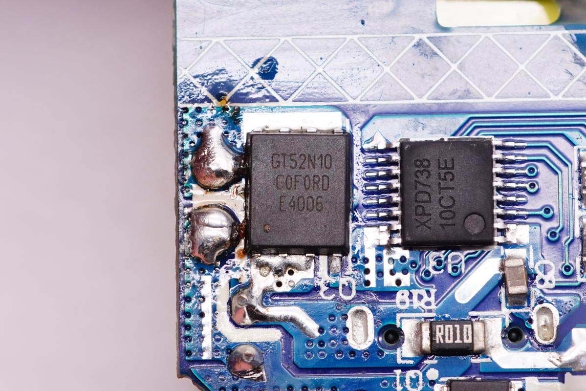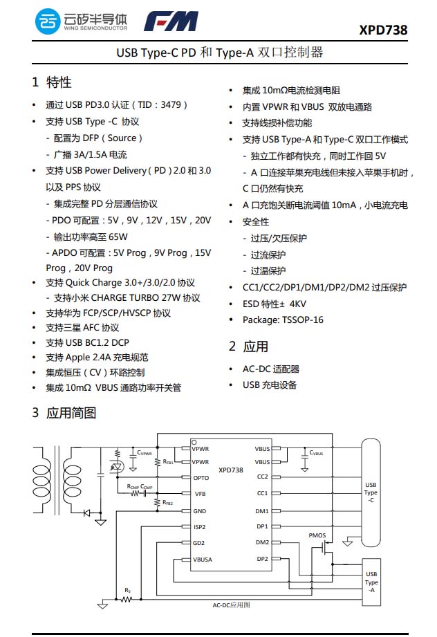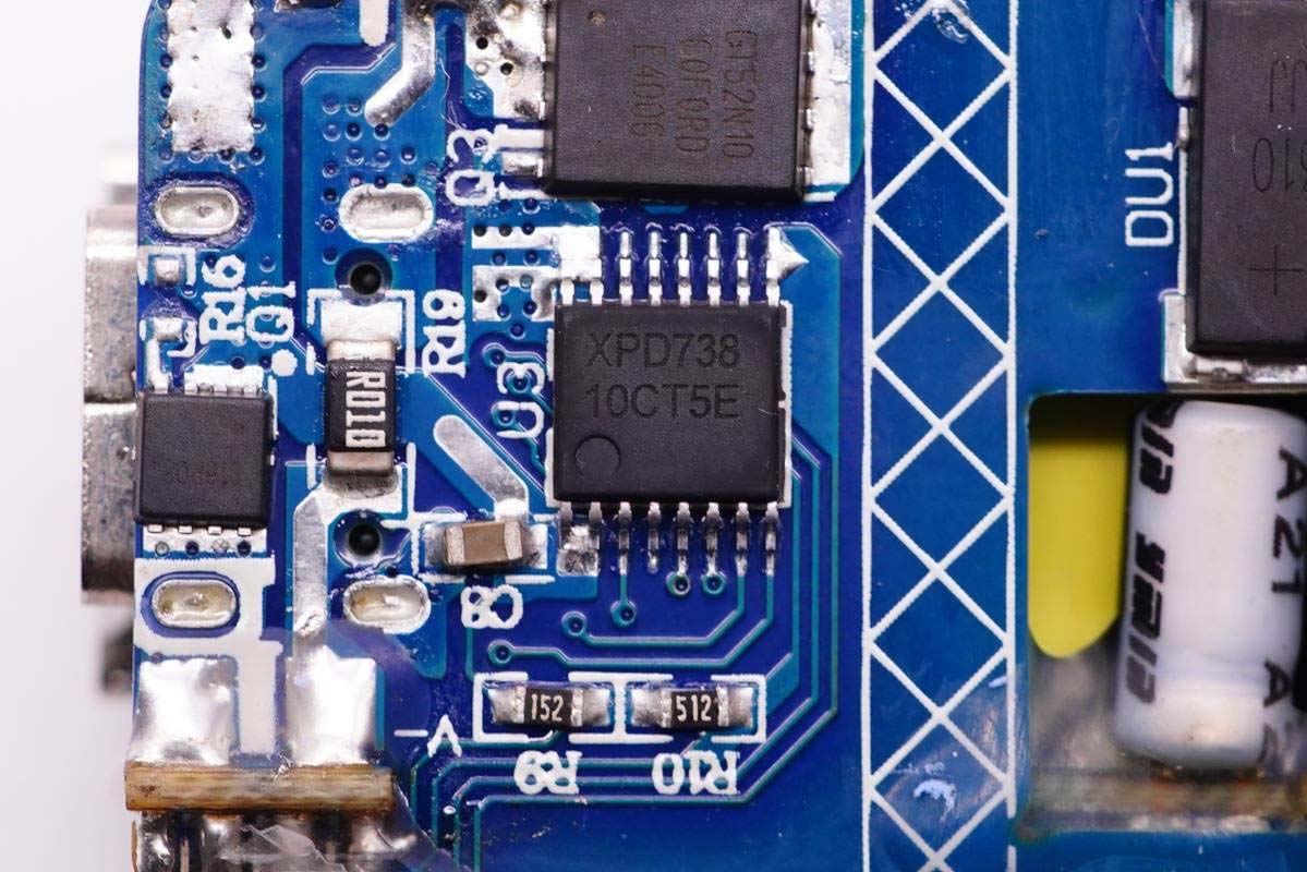 协议芯片采用云矽半导体XPD738,用于1C1A双口控制。XPD738通过了USB PD3.0认证(TID:3479),支持PD2.0/3.0、PPS、QC2.0/3.0、FCP、SCP、HVSCP、AFC等快充协议,很适合应用在1C1A双端口充电设备上,支持任意单口快充双口输出5V,在A口连接苹果充电线但未接入苹果手机时,C口仍然有快充。