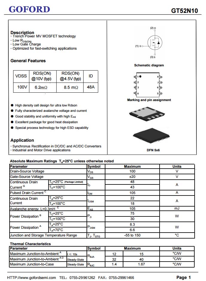 次级同步整流MOS管采用谷峰GT52N10,耐压100V,DFN5x6封装。