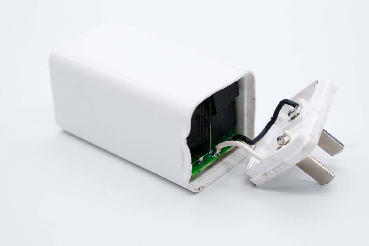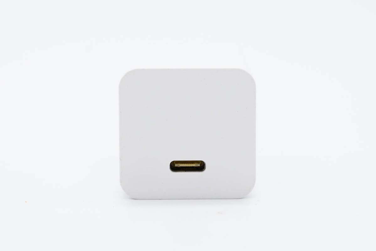 充电器采用常见方柱造型设计,腰身光滑洁白,各面间过渡圆润,输入端采用固定式国标插脚。