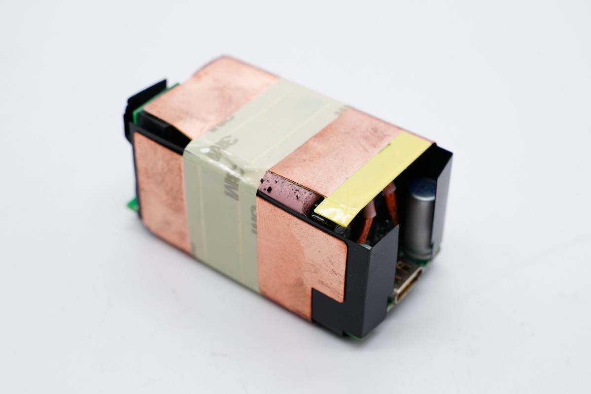 PCBA模块包裹隔离板和黄铜散热片,并且粘贴胶带固定。