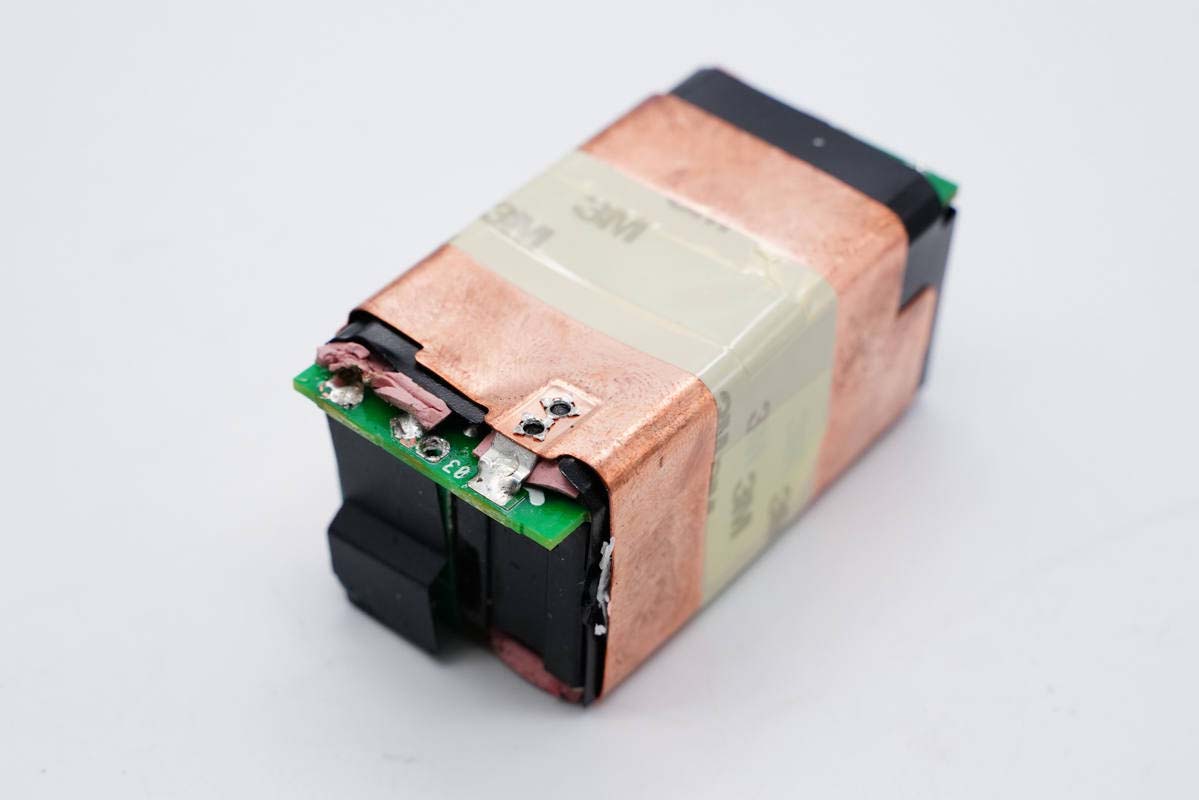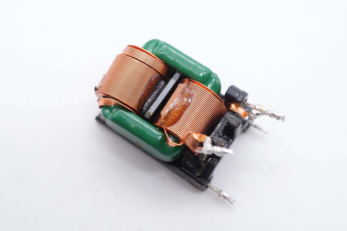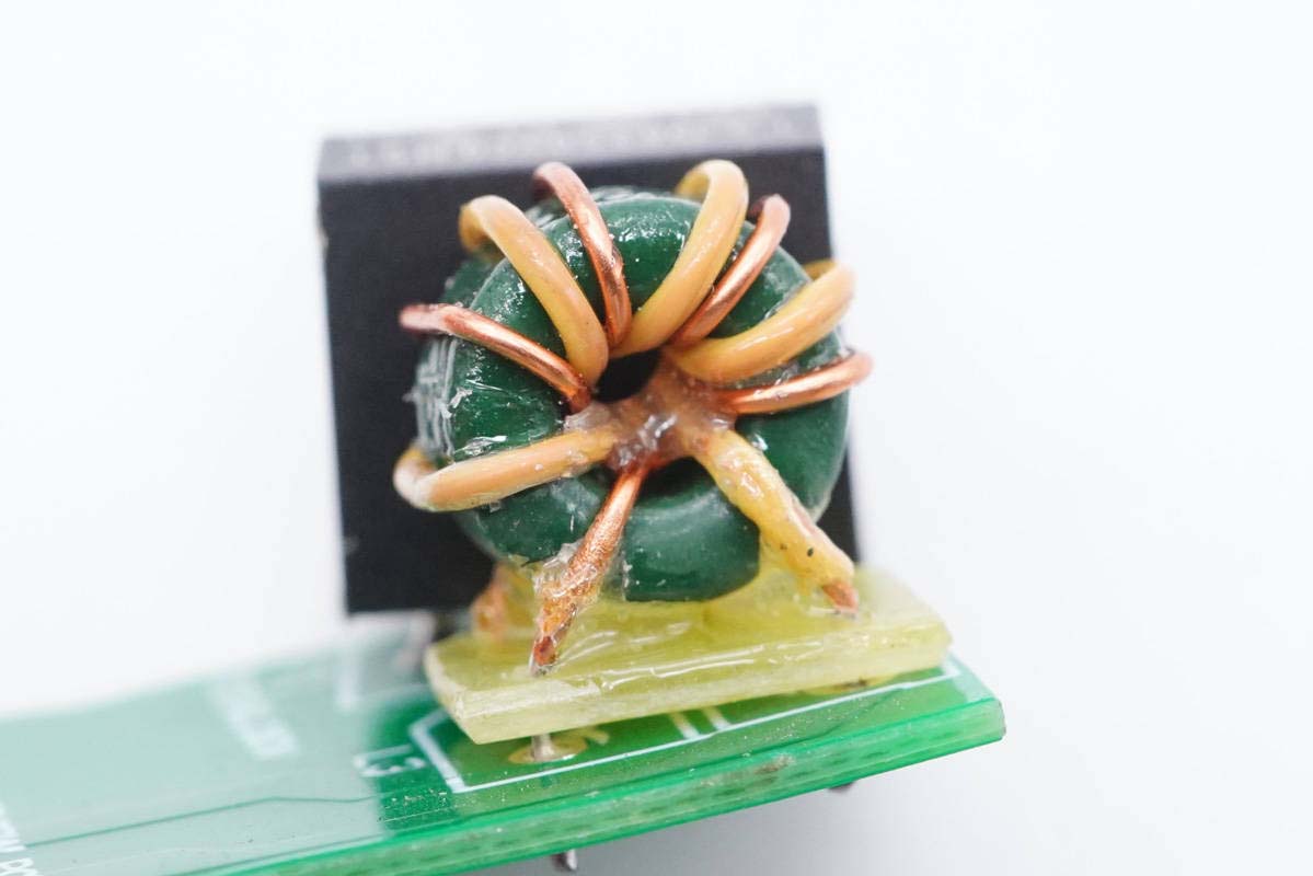 另一颗共模电感扁平铜带绕制,绿色磁芯。输入端设计两级共模电感用于滤除EMI干扰。
