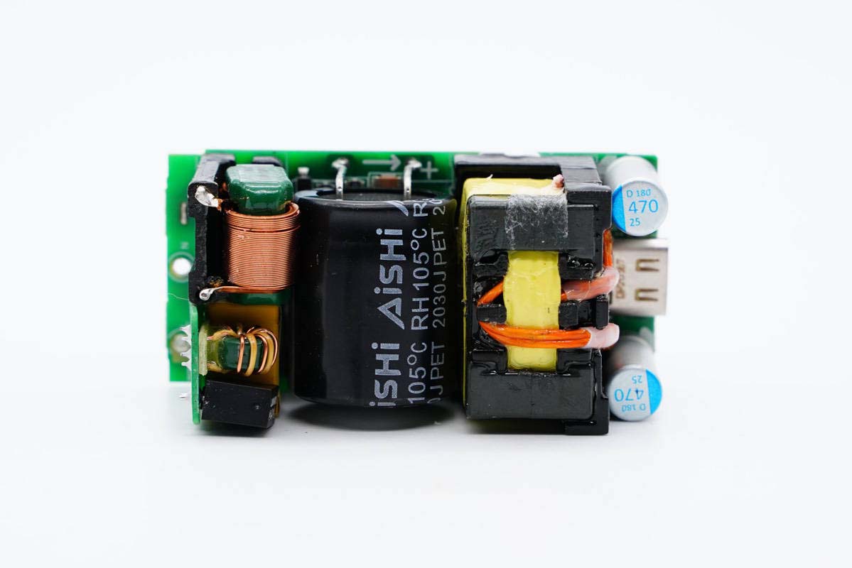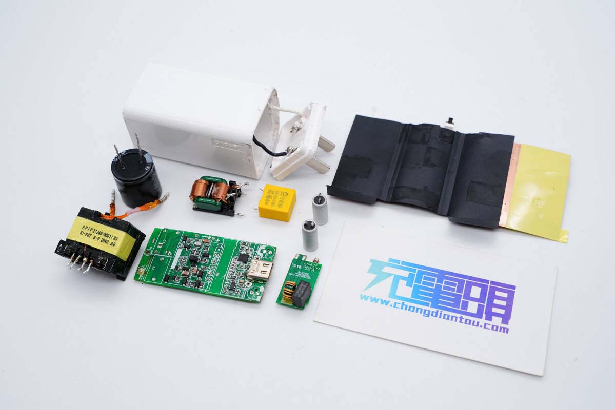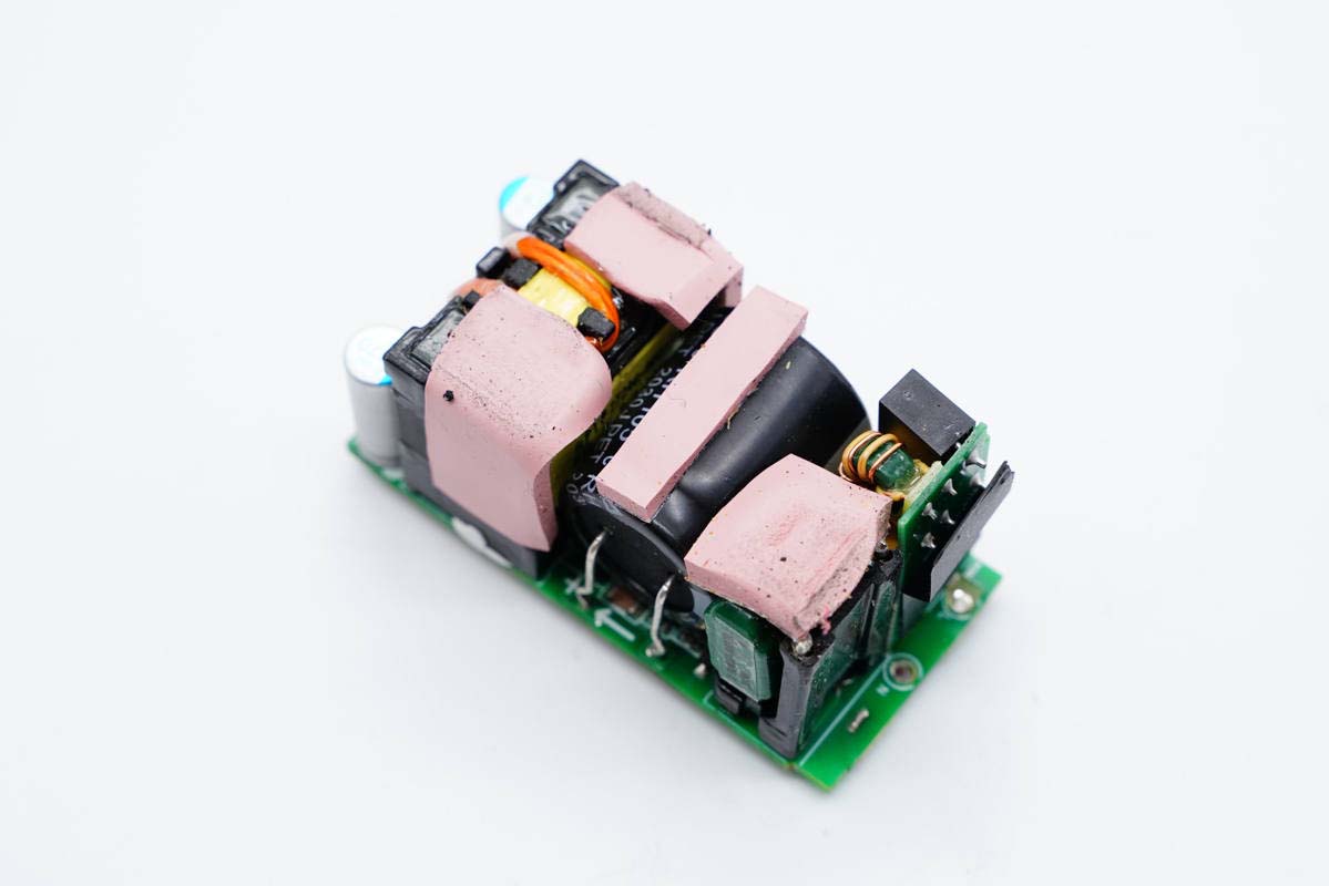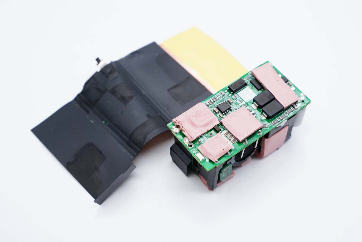 充电器输入端设有小板,左侧共模电感还配有塑料底座,中间横置一颗高压滤波电解电容,单颗大容量方案。