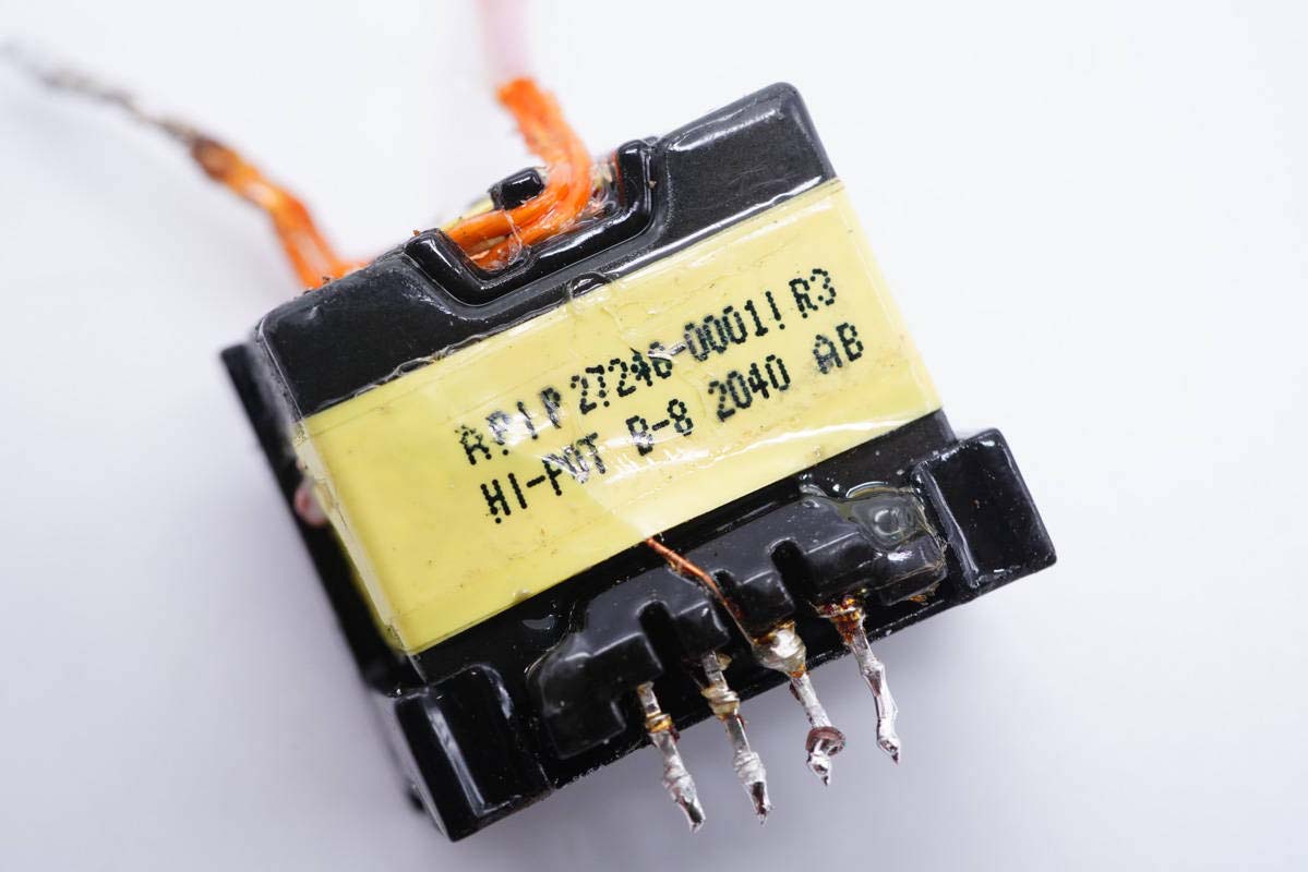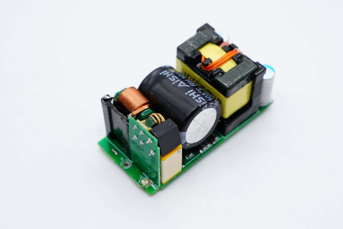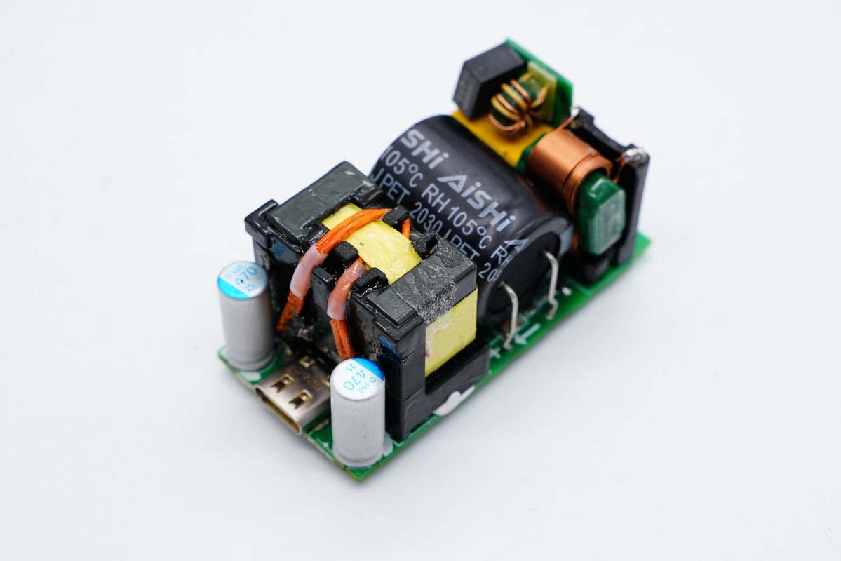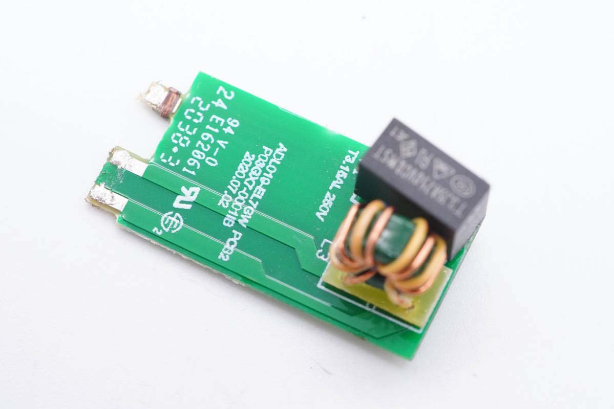 充电器输入端设有小板,左侧共模电感还配有塑料底座,中间横置一颗高压滤波电解电容,单颗大容量方案。