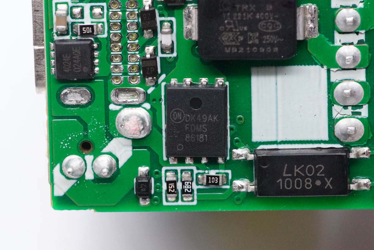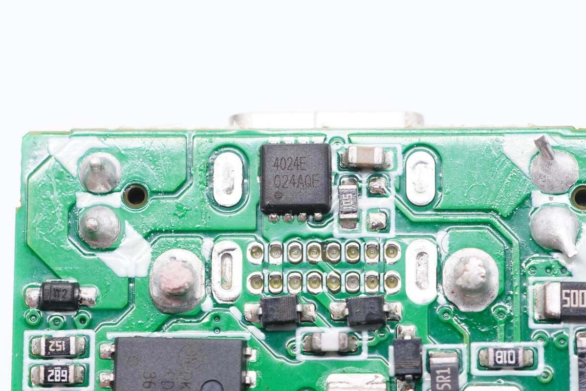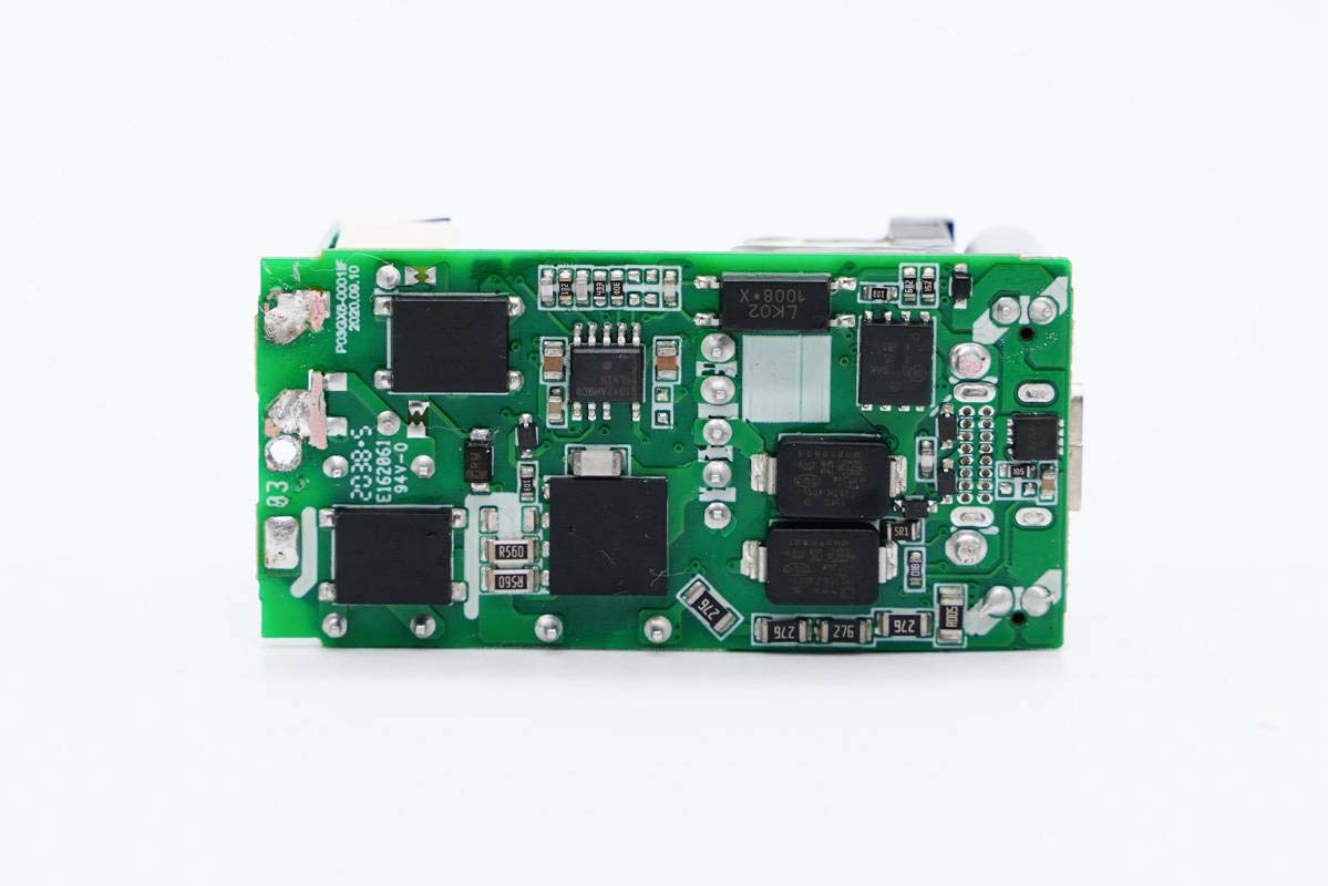 PCB板背面一览,有两颗整流桥,开关电源主控芯片以及高压开关管、光耦、两颗贴片Y电容、同步整流管以及输出VBUS开关管,整个外围看上去非常简洁。