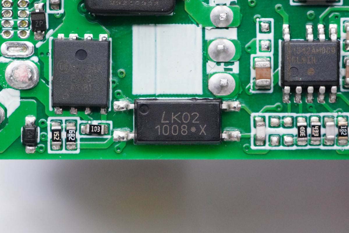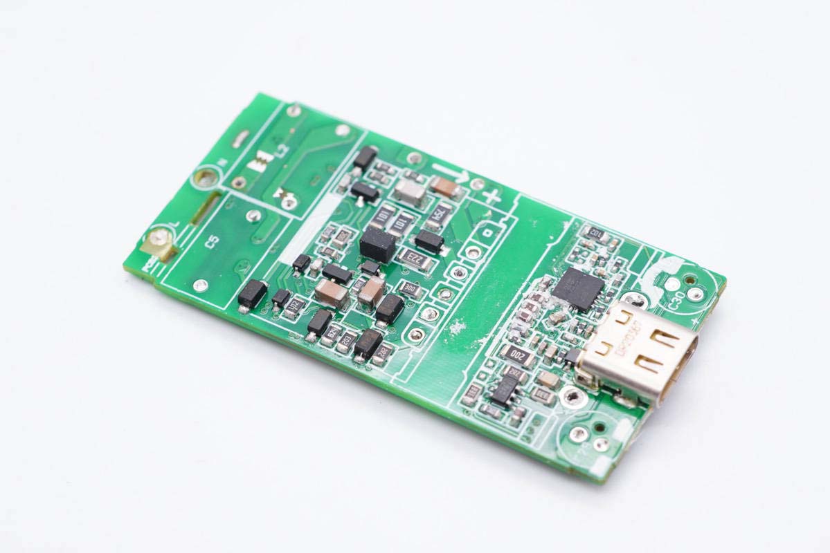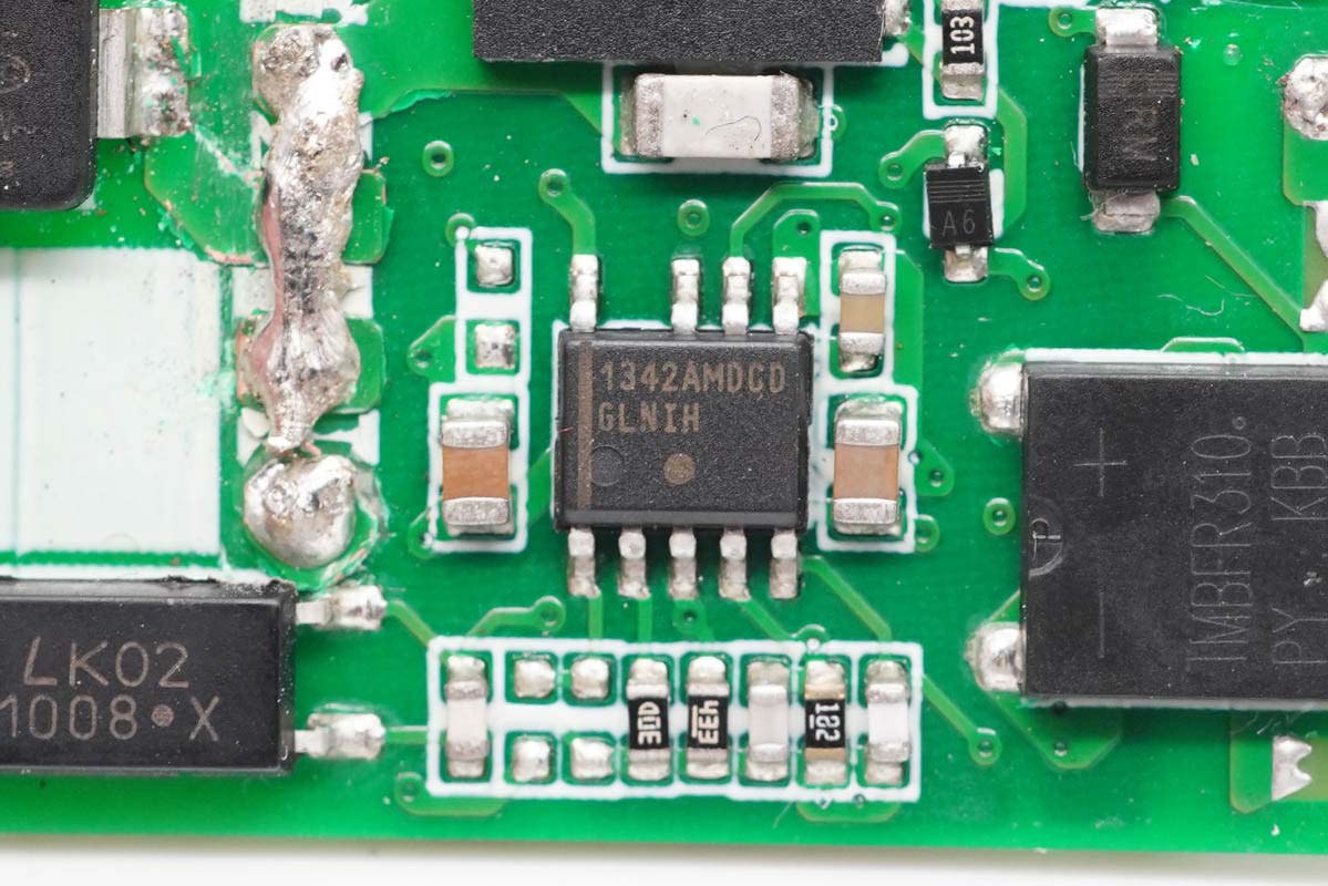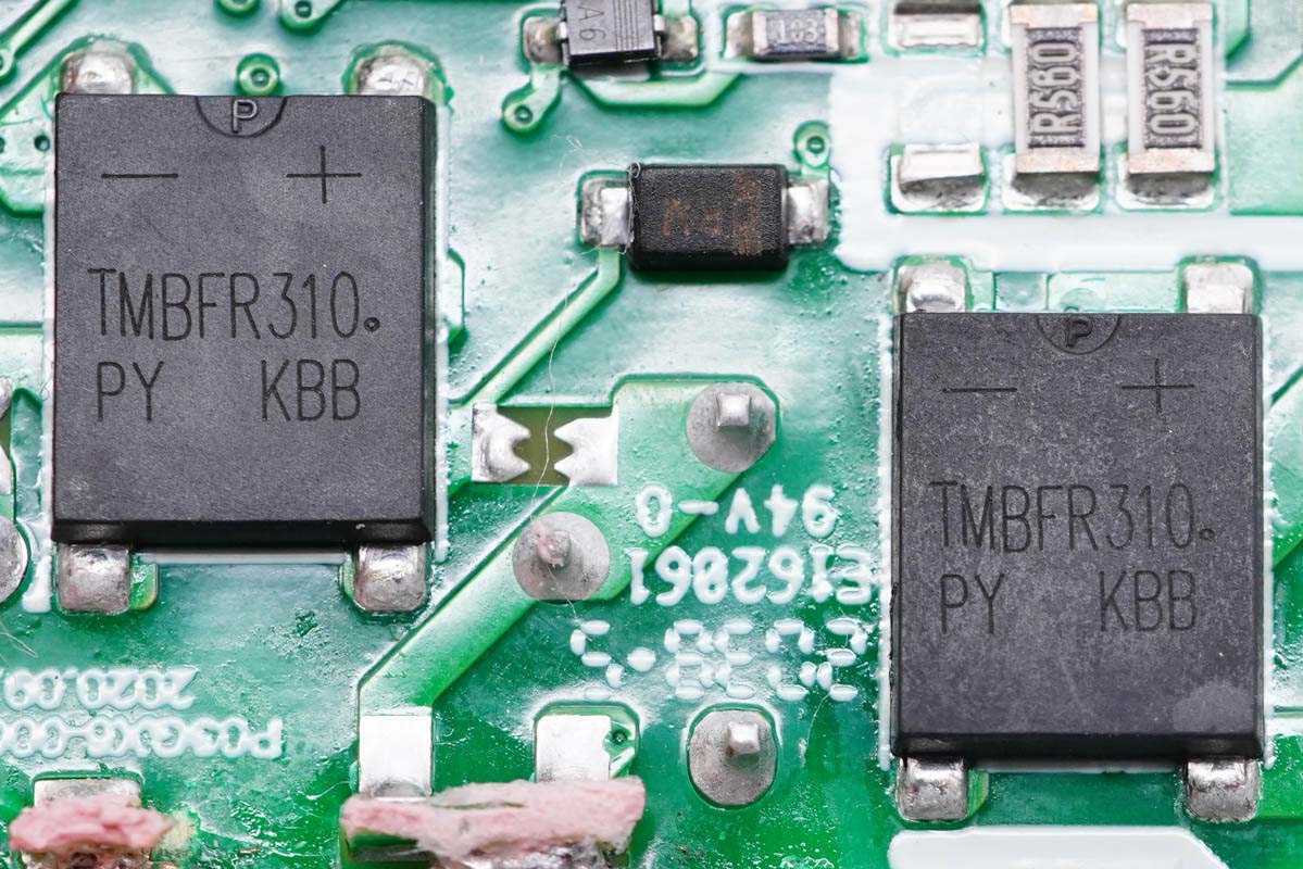 PCB板背面一览,有两颗整流桥,开关电源主控芯片以及高压开关管、光耦、两颗贴片Y电容、同步整流管以及输出VBUS开关管,整个外围看上去非常简洁。