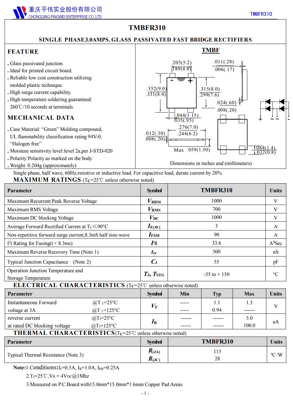 重庆平伟TMBFR310整流桥特写,最高工作温度150℃,最大浪涌电流90A,这里设置两颗以均摊发热。