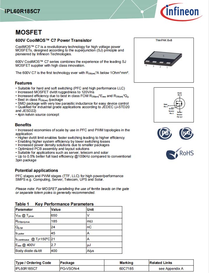 丝印60C7185,实际是英飞凌IPL60R185C7,耐压650V,导阻185mΩ。