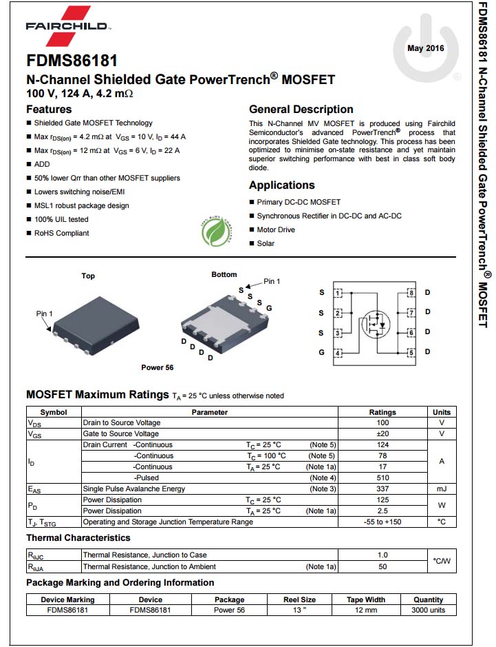 同步整流管采用安森美FDMS86181,耐压100V,导阻4.2mΩ。