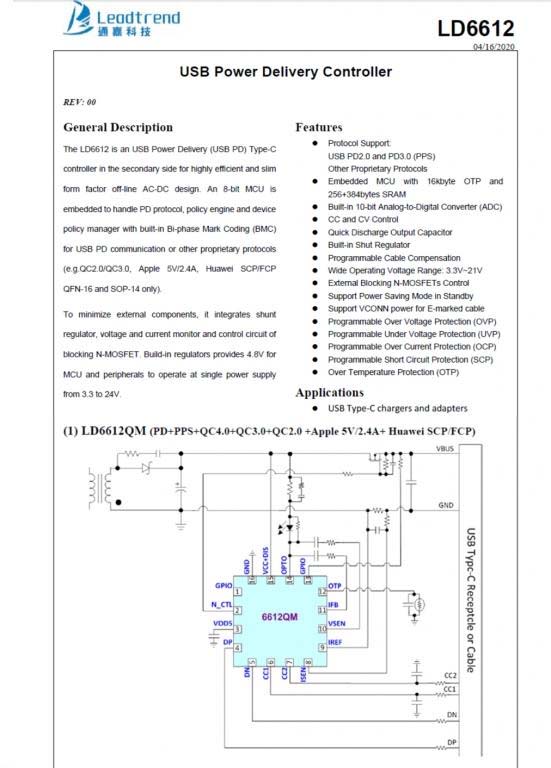 LD6612结合了USB-PD baseband PHY、Type-C cable侦测、并联稳压器、电压和电流监控、负载开关NMOS控制电路及微控制器。芯片内建的稳压器可让工作电压操作于3V~24V,协议支持:PD3.0,PPS,FCP/SCP,QC5/QC4+/QC3.0/QC2.0,Apple5V2.4A,BC1.2等。