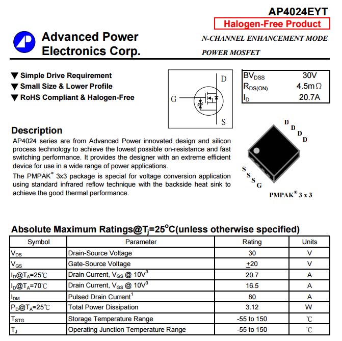输出VBUS开关管采用富鼎AP4024EYT,NMOS管,耐压30V,导阻4.5mΩ。