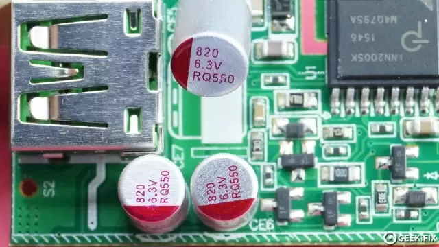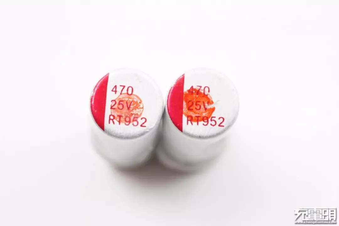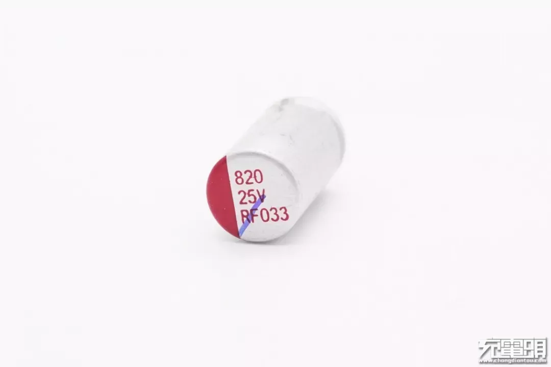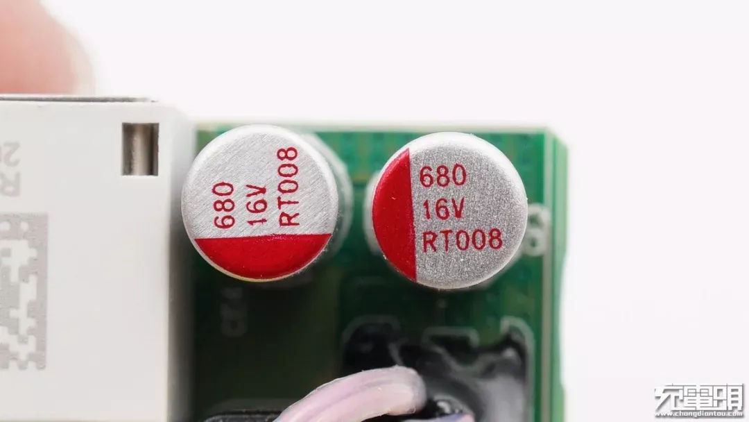 小米65W USB PD快充充电器中使用柏瑞凯卷绕式高分子固态铝电解电容,使用两颗RT系列电容并联,25V470μF,ESR为12mΩ,纹波电流4.4A。