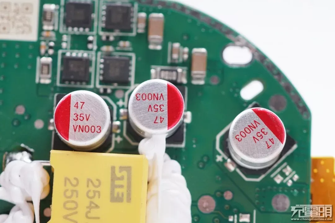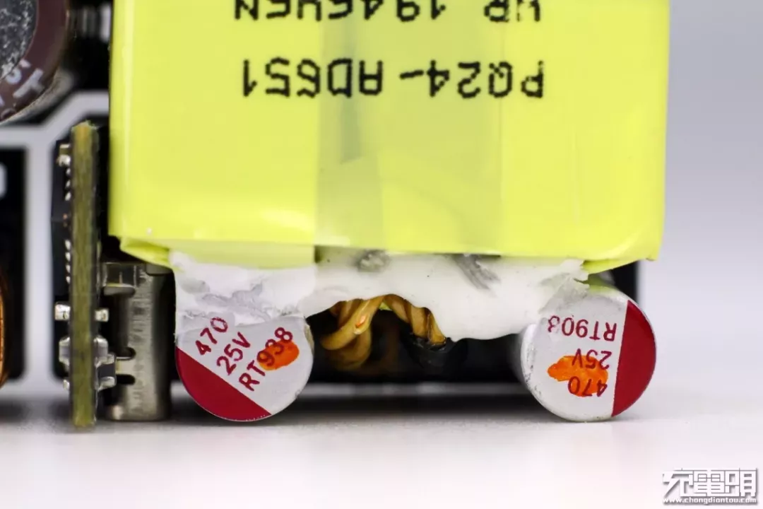 小米65W疾速闪充版在输出滤波使用了两颗柏瑞凯卷绕式高分子固态铝电解电容,为高纹波电流的RT系列,105℃2000小时。470μF25V,电容ESR为12mΩ,纹波电流4.4A,两颗并联为输出滤波。