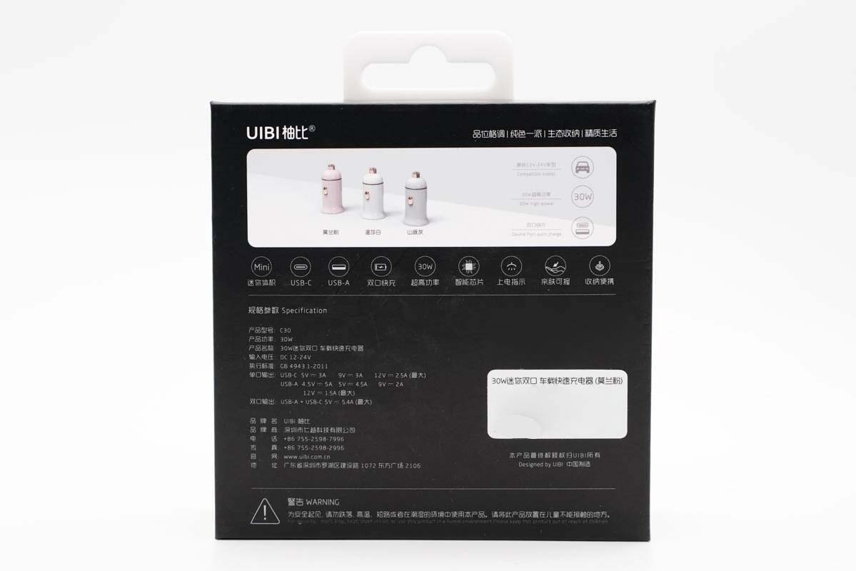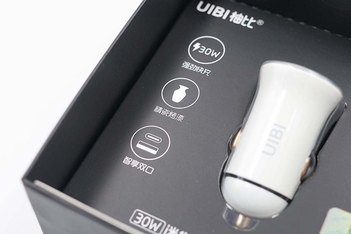 盒子一侧印有UIBI柚比品牌以及30W快充、精瓷烤漆、USB接口三大特性标识。