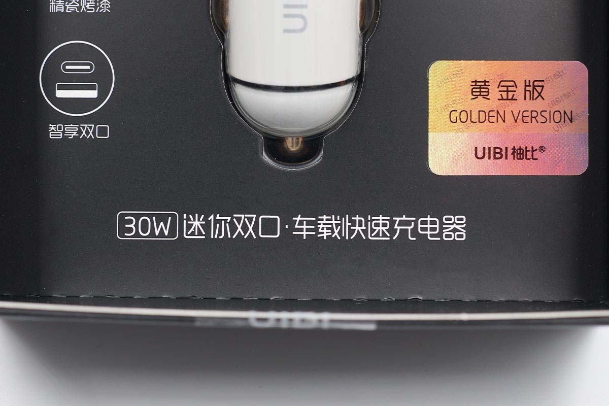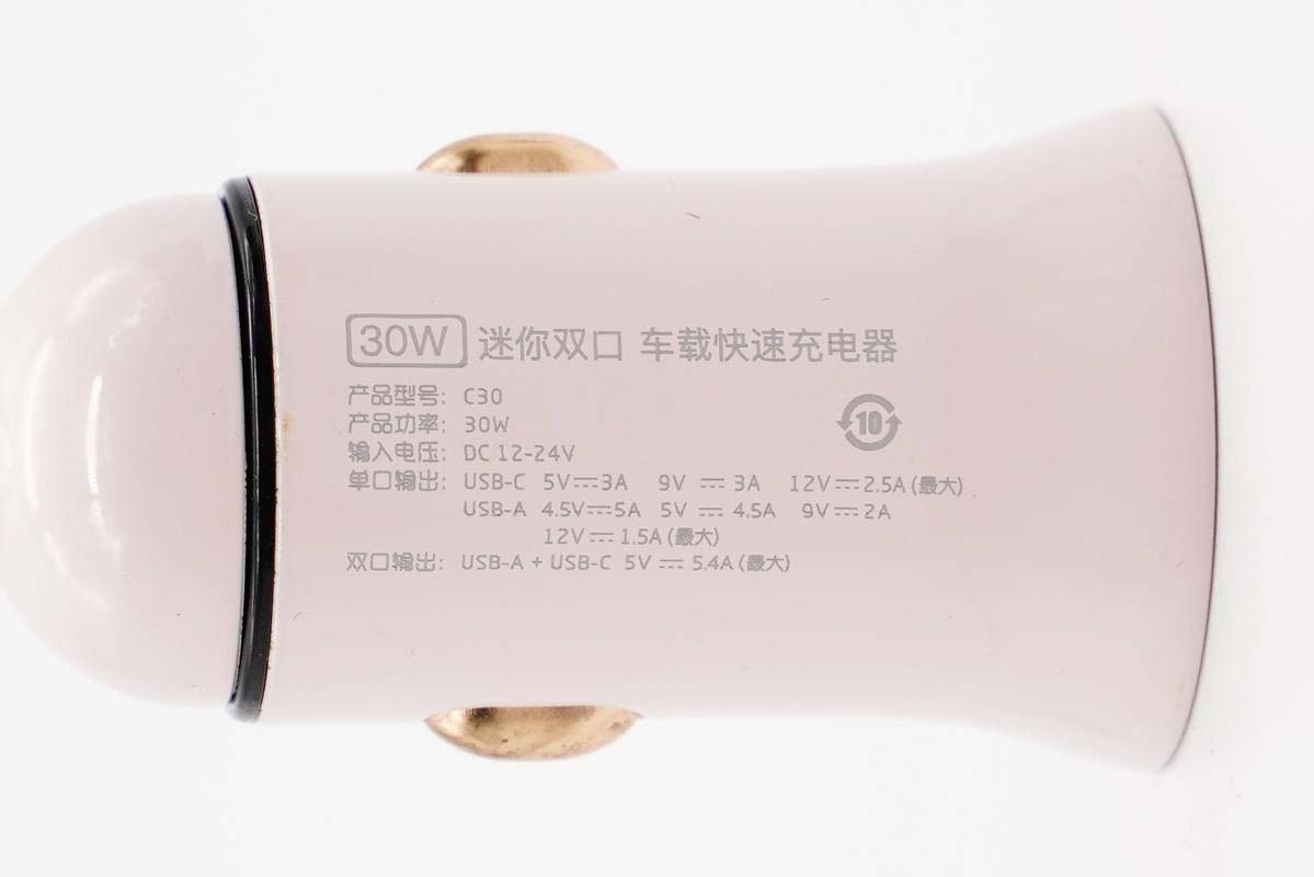 另一侧贴有黄金版标签,下方是30W迷你双口·车载快速充电器名称。