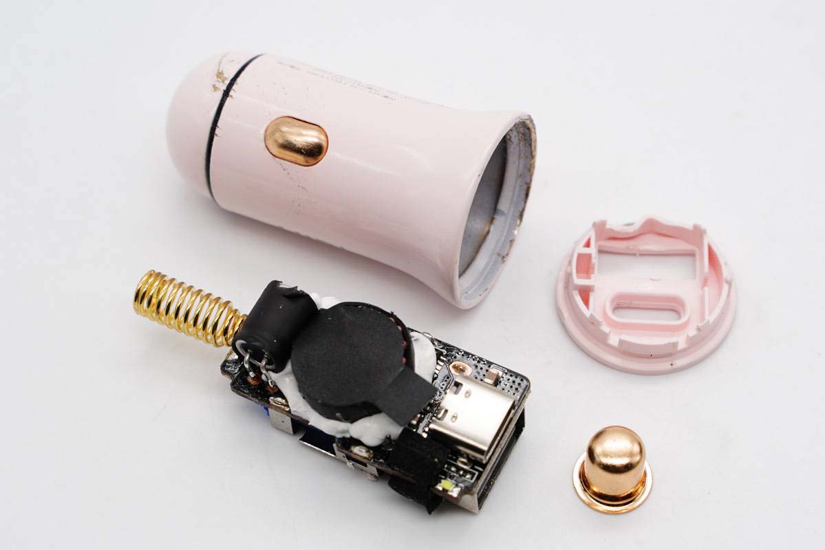 充电头网通过拆解了解到,这款车充采用了智融SW3510快充解决方案,进行输入降压和接口协议识别,控制1A1C接口输出电压,此外为芯片覆盖导热垫并配有散热片。输入输出端配有钰邦和万裕ULR系列固态电容进行滤波,电容全部做了绝缘处理。产品整体用料扎实,做工讲究。