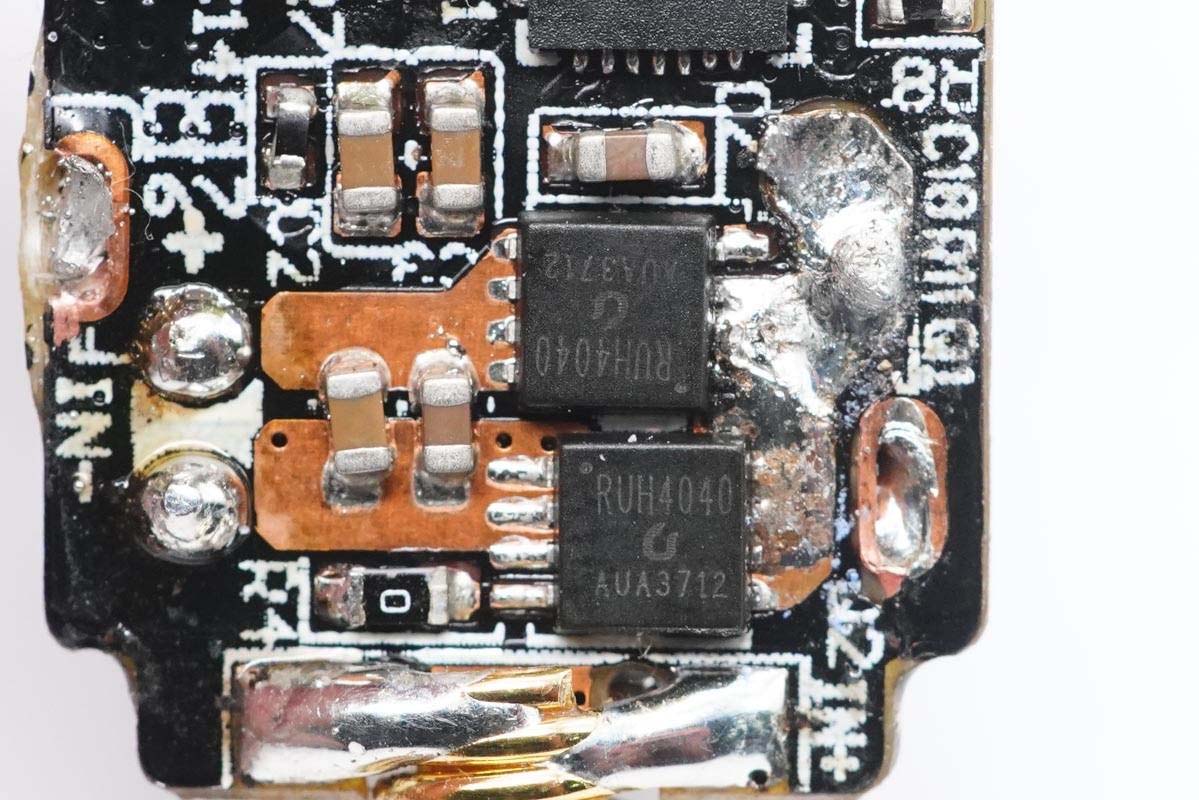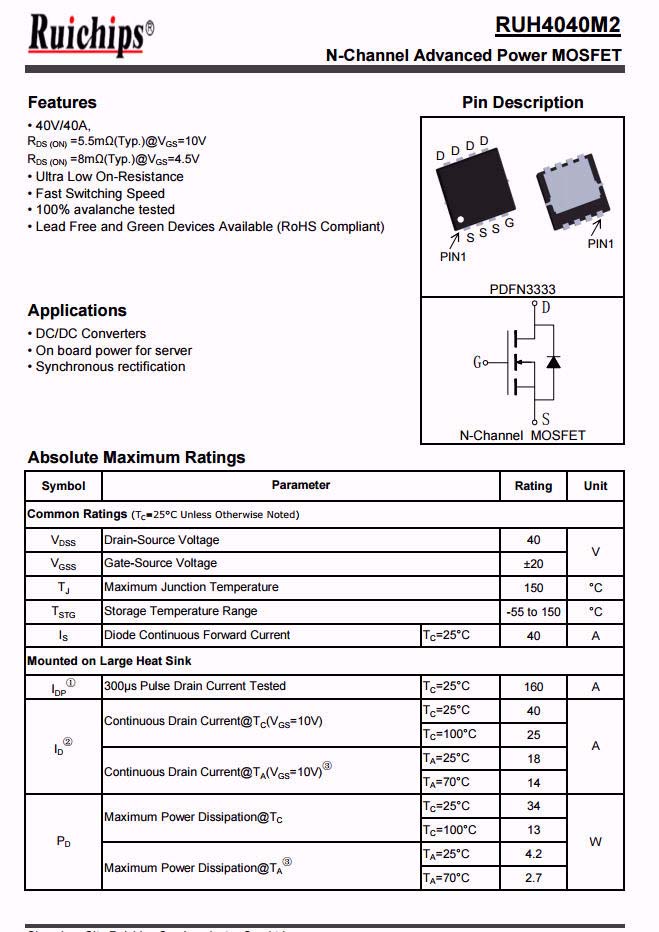外挂两颗锐骏RUH4040M2 MOS管为接口输出同步整流降压,NMOS,耐压40V。
