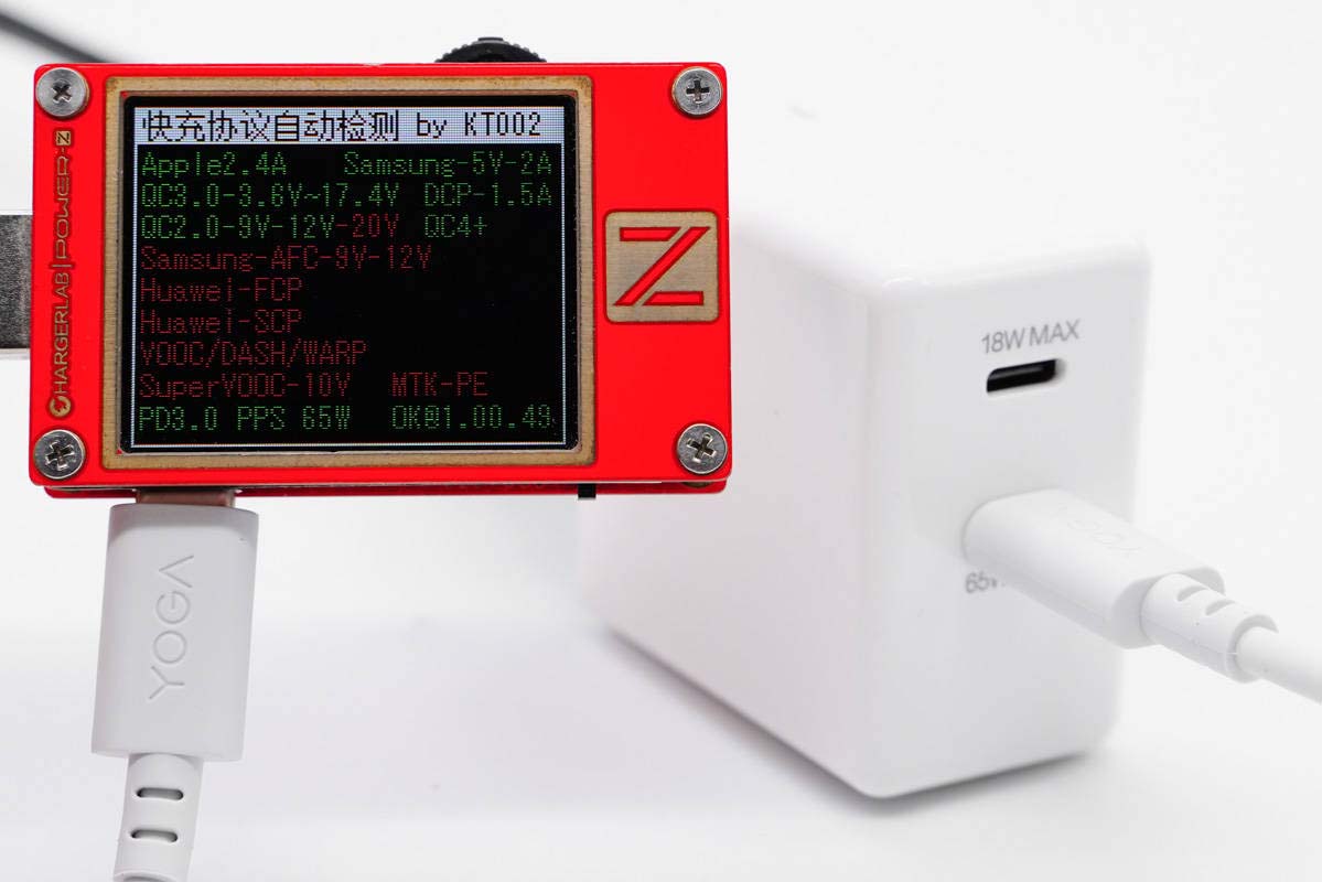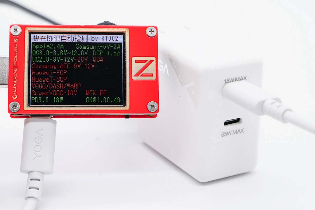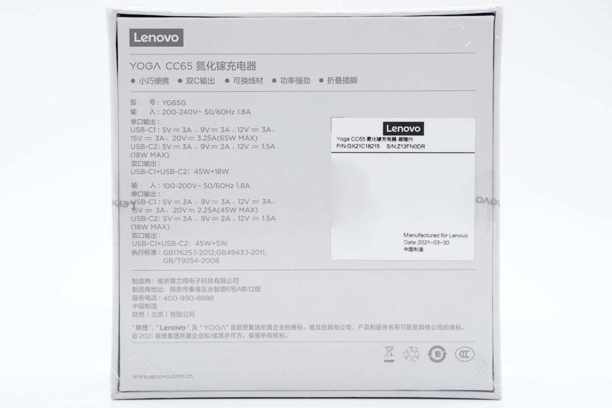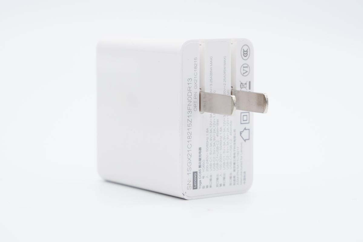 联想YOGA CC65双口氮化镓充电器机身光滑简洁,边角圆润,配备可折叠插脚和双C输出口,功率密度做到了0.88W/cm³,整体十分小巧。C1和C2口分别支持最大65W/45W和18W快充,视输入电压大小决定,支持QC、PD、PPS通用快充协议,支持45W+18W双口同时快充策略,满足笔电和手机同时快充需求。