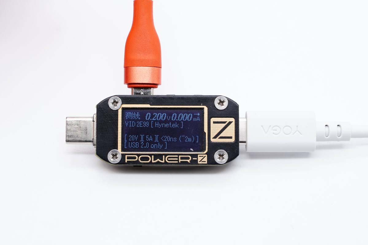 使用ChargerLAB POWER-Z KM001C检测,显示该线缆带有E-Marker芯片,电力传输能力为20V5A,数据传输能力为USB 2.0。