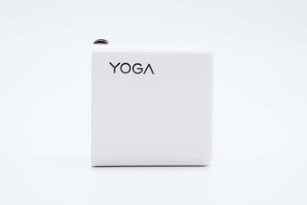 方形包装盒设计简约,顶面中心是充电器外观图,左上角是YOGA品牌和产品名称,右下角设有Lenovo品牌。