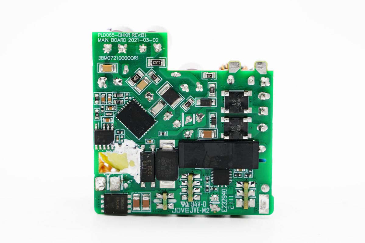 纳微半导体GaNFast第三代技术的芯片,作为集成度非常高的一款芯片,不仅集成了功率芯片,还包括了保护,驱动和逻辑,相对其他芯片集成度更高,散热温控效果更好,转化效率也非常好。