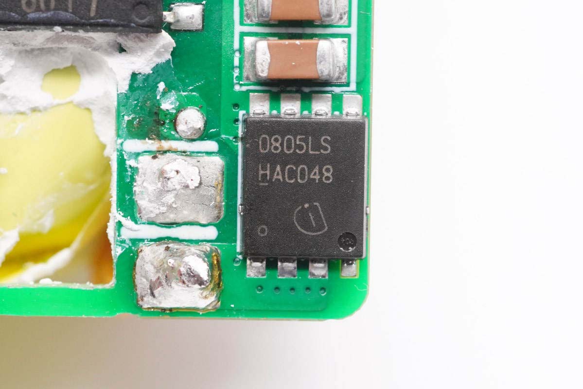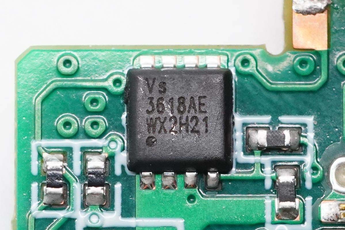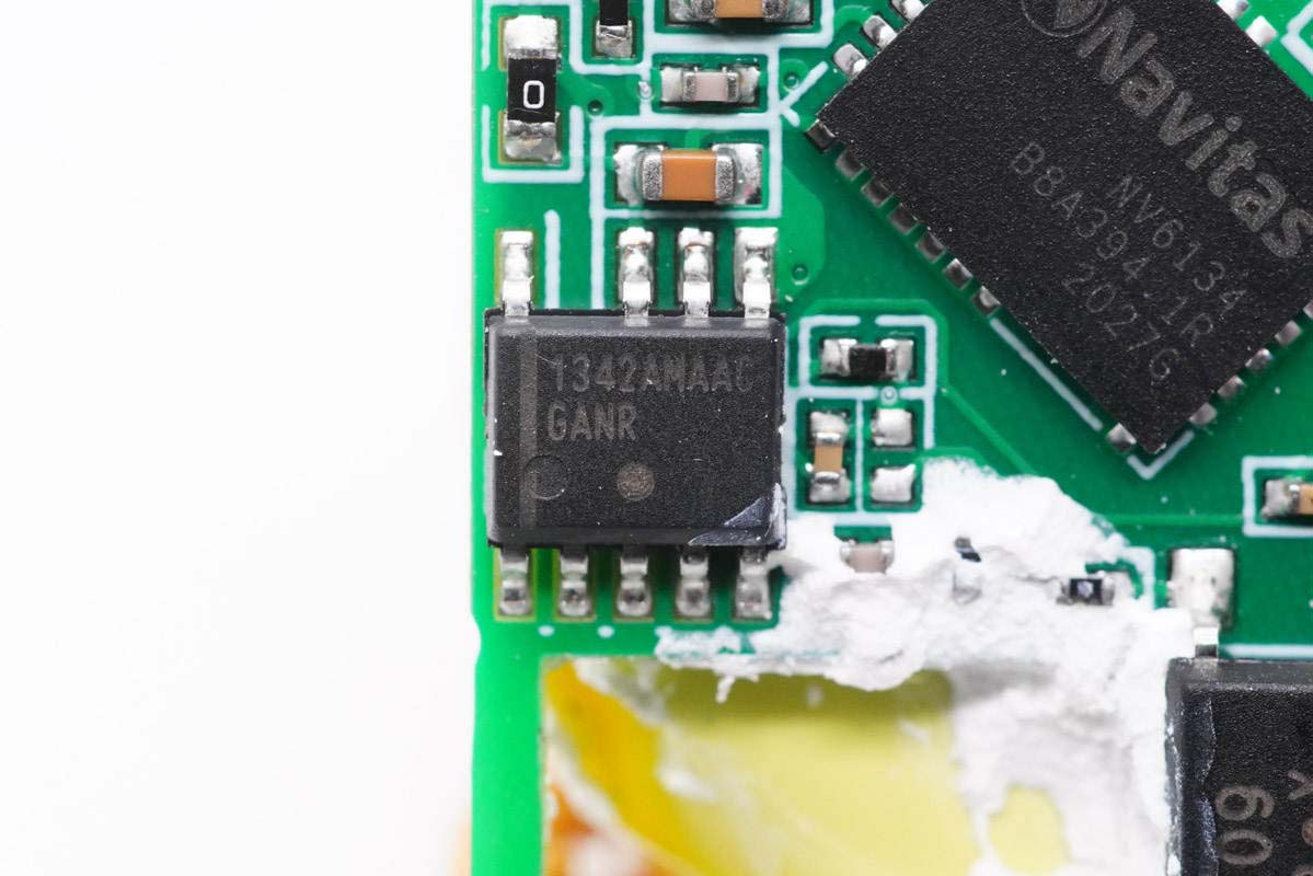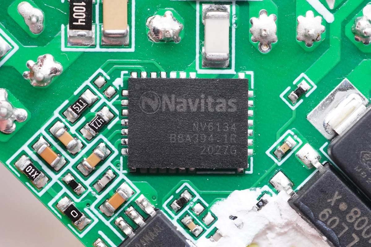 氮化镓功率芯片采用纳微NV6134,这是纳微第三代氮化镓芯片,拥有更强大的电气保护性能,响应速度相比之前要快三倍。相比于分立的氮化镓芯片/器件设计(Discrete GaN designs),纳微GaNFast氮化镓芯片具有10倍更高的静电耐压。