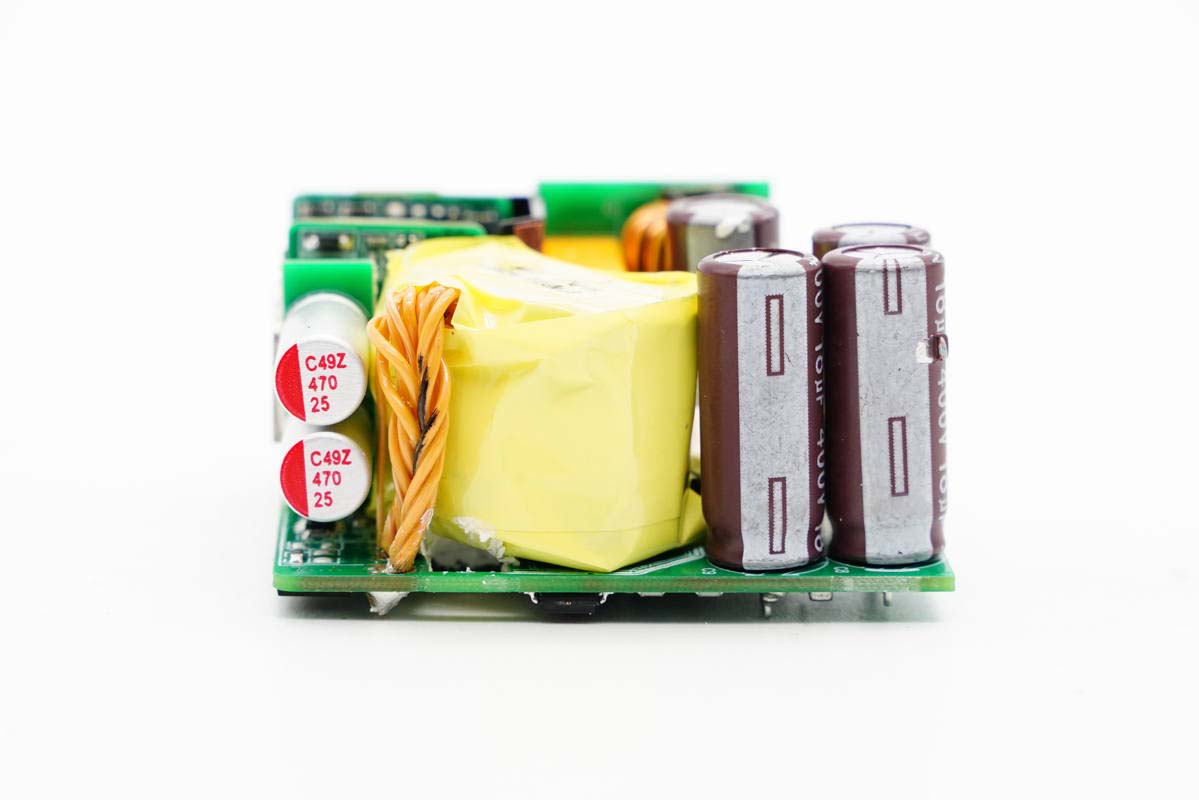 输入端一览,主板右侧设有延时保险丝,小板上有两颗共模电感,另一侧设有四颗高压滤波电解电容,滤波电感被挡住,打胶固定。