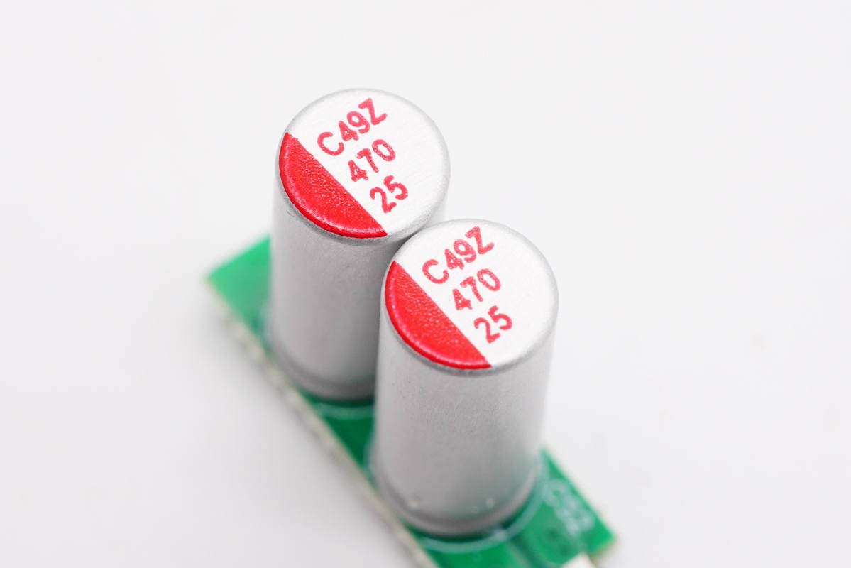 输出滤波固态电容两颗并联,规格均为25V 470μF。