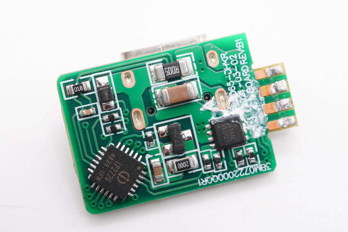 背面设有协议芯片,输出VBUS开关管和电流采样电阻。