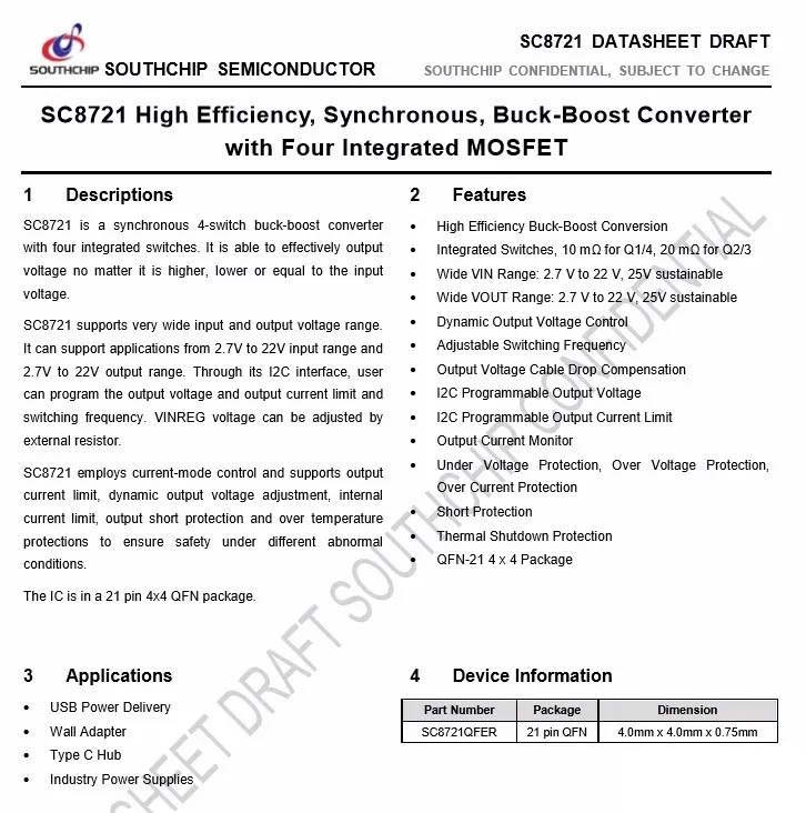 USB-C2口同步升降压转换器采用南芯半导体SC8721。SC8721内部集成四管H桥升降压开关管,输入输出电压范围均为2.7-22V,工作电压范围宽,支持动态输出电压调整,开关频率可调节,支持输出线补、输出电流监测,支持I2C总线控制的输出电压调节和输出限流调节,内置全面的保护功能。