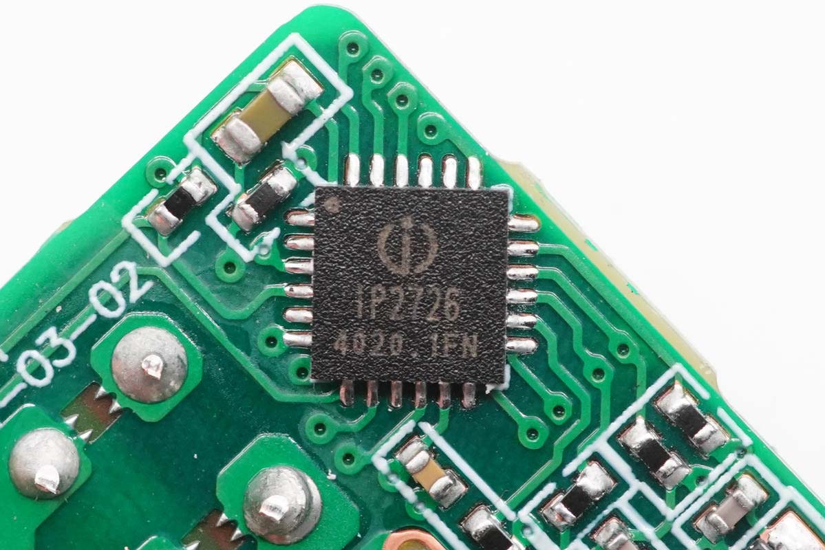 协议芯片采用英集芯IP2726,这是一颗集成多种协议、用于USB输出端口的快充IC,支持Type-C DFP、PD2.0/3.0、PPS、QC4+、QC2.0/3.0、FCP、AFC、SCP、MTK PE+、Apple2.4A、BC1.2以及三星2A等协议。具有高集成度和丰富的功能,在应用时仅需极少的外围器件,有效减小整体方案的尺寸,降低BOM成本。