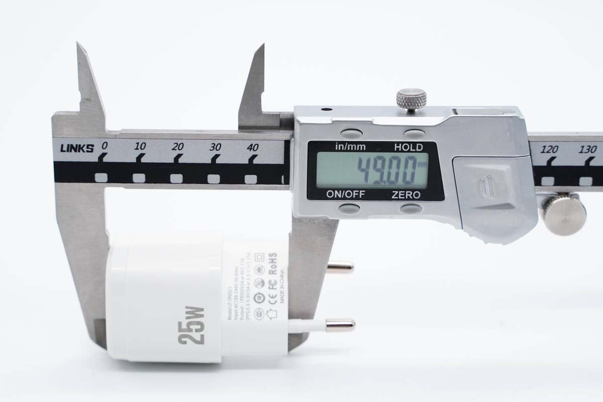 使用游标卡尺实测充电器外壳总长度为49mm。
