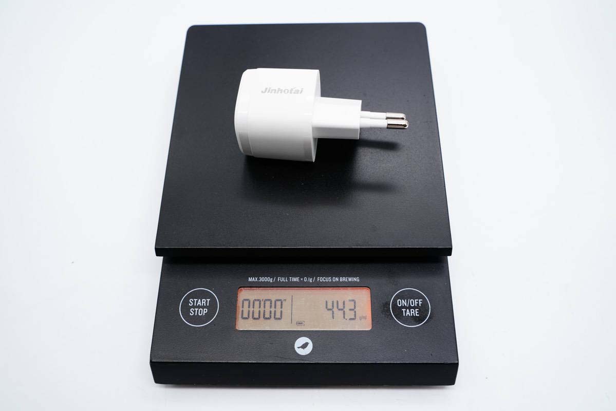 这款充电器采用PC材质白色外壳,腰身两端亮面,中间区域哑光,其中一面印有JinHotai,输入端采用欧规长插脚。