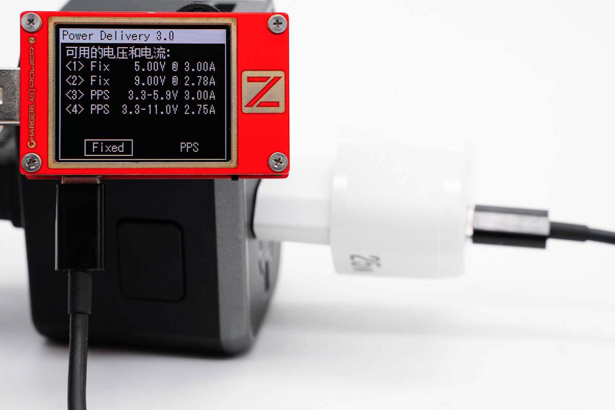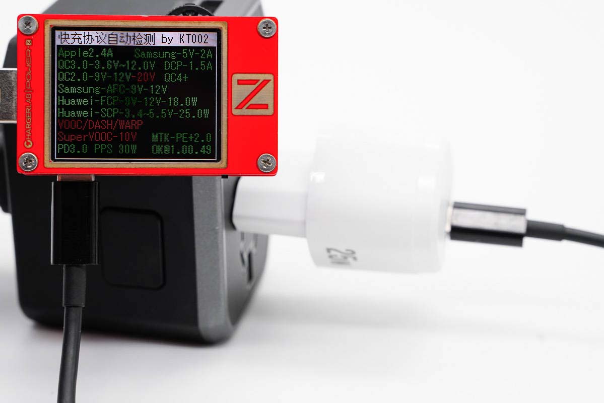 使用ChargerLAB POWER-Z KT002测得USB-C口支持Apple 2.4A、Samsung 5V2A、DCP协议,以及QC2.0/3.0、AFC、FCP、SCP、PE2.0、PD3.0、PPS快充协议。