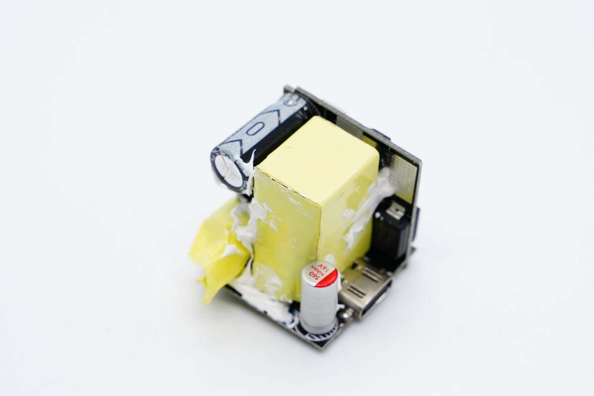 充电器采用两块PCB板垂直焊接结构,变压器打胶加固。