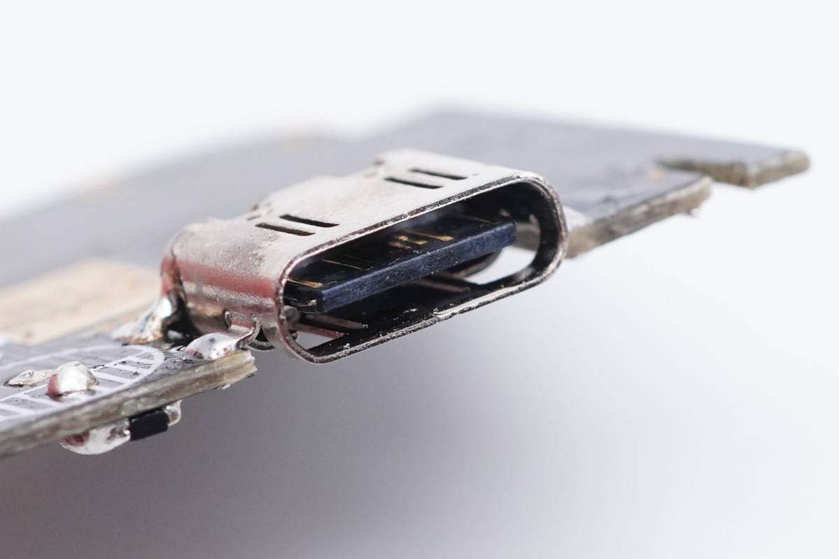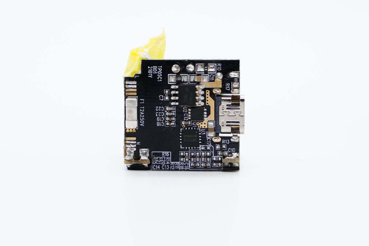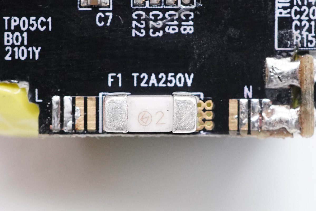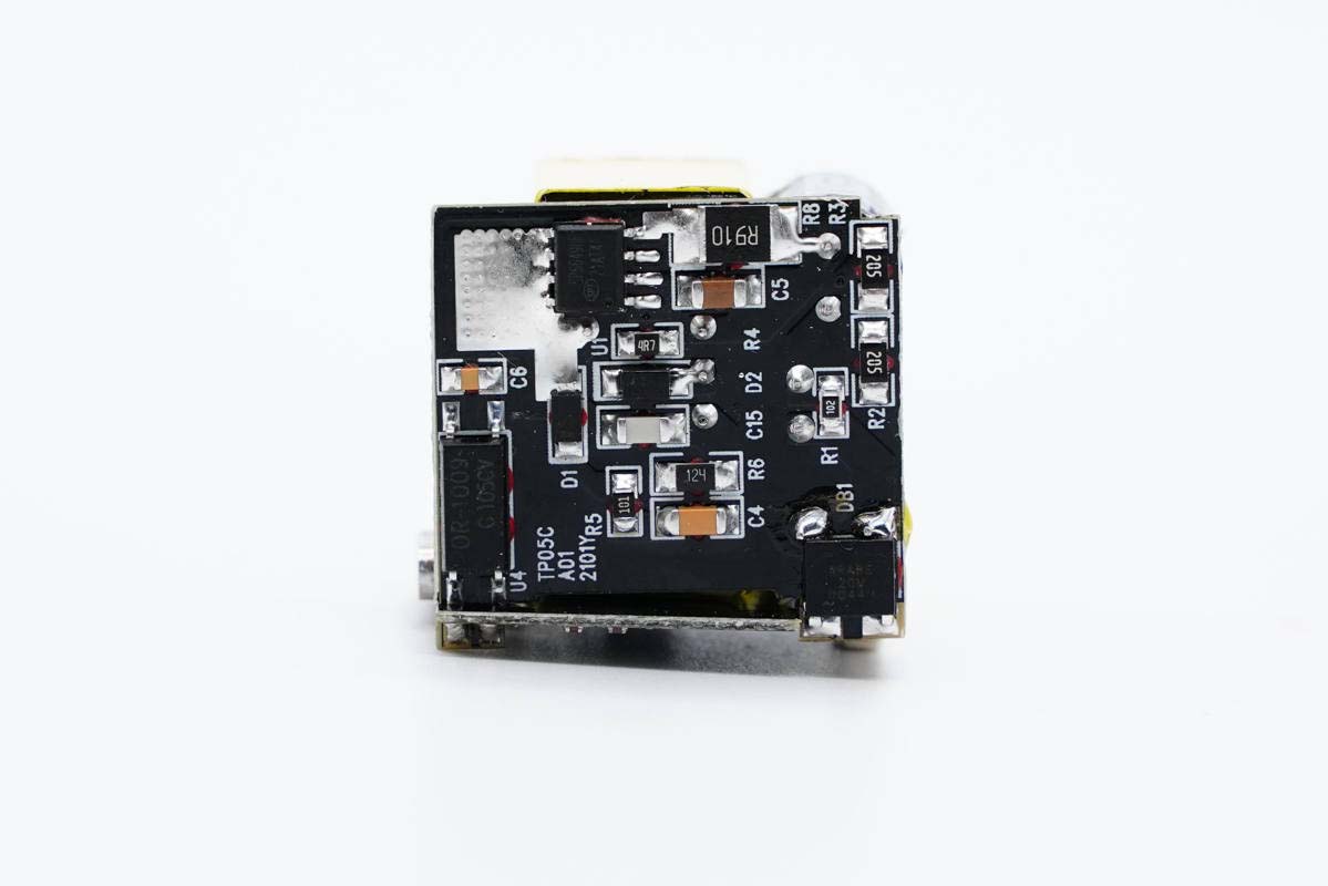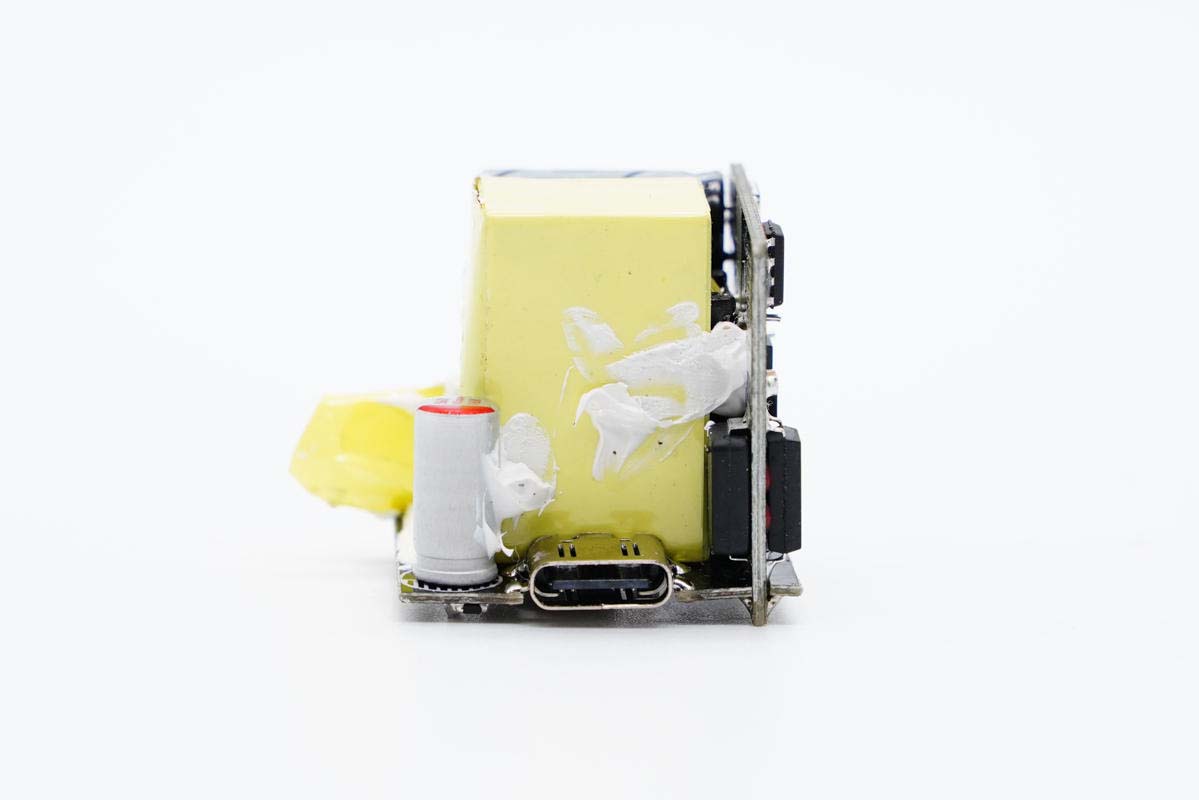主板背面设有保险丝、同步整流芯片、协议芯片以及输出VBUS开关管,初次级分界明显,USB-C母座沉板设计。