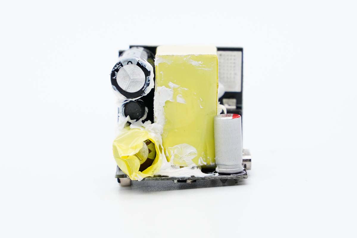 从另一侧看去,正面设有工字电感、两颗高压滤波电解电容、变压器和贴片Y电容,其中一颗电容包裹绝缘胶带。
