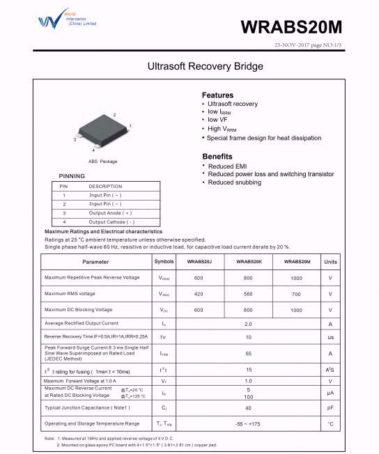 整流桥采用深圳市沃尔德实业有限公司的WRABS20M。这颗软桥通过较软的恢复曲线,比较平滑的关断特性,可以降低二极管结电容达到非常少的谐波振荡产生的效果。