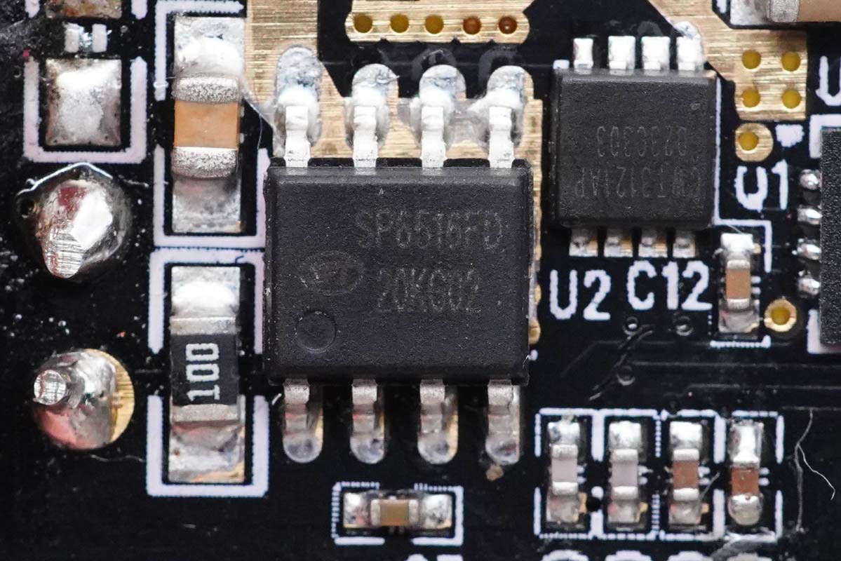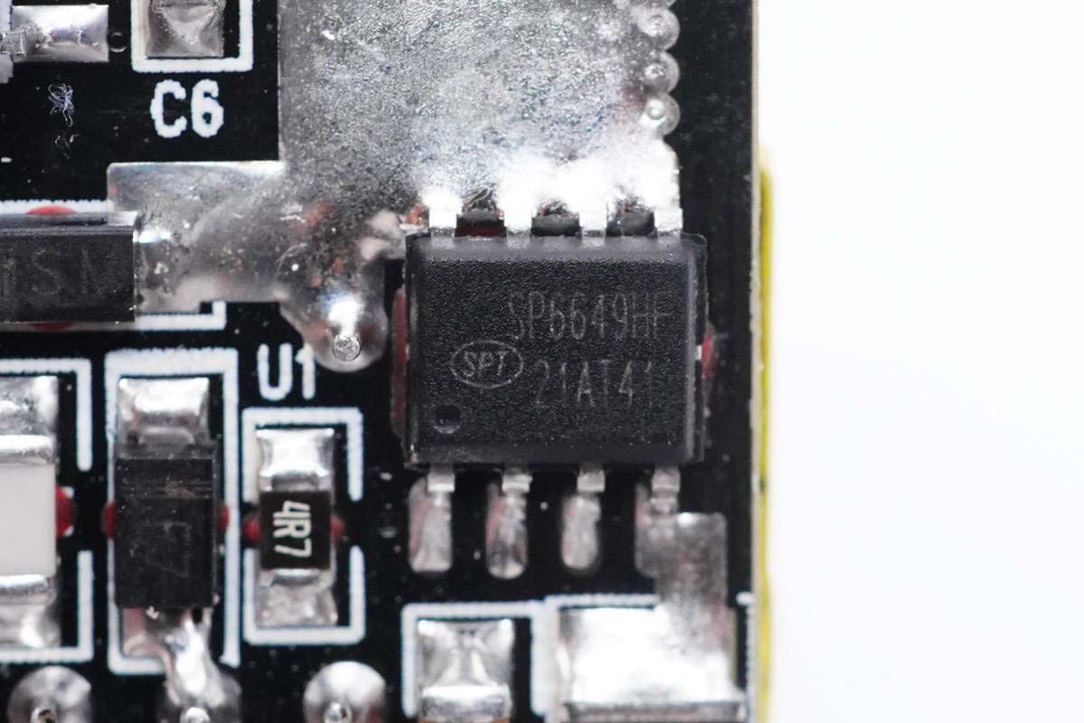 充电头网通过拆解了解到,充电器采用两块PCB板垂直焊接,L型结构设计。采用了硅动力SP6649HF+SP6516F高集成快充方案,帮助充电器实现小型化。另外采用智融SW2303控制输出电压,该芯片是业内首颗非MCU架构的QC5认证协议芯片,性能强悍,充电器支持如此齐全的快充协议正是得益于它。