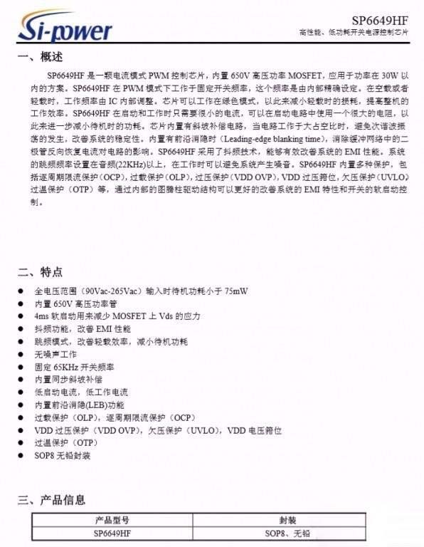 开关电源主控芯片采用硅动力SP6649HF,这是一颗电流模式PWM控制芯片,内置650V高压功率MOSFET,应用于功率在30W以内的方案,固定65KHz开关频率,内置抖频功能用于改善EMI性能,跳频模式提高轻载效率,降低待机功耗。同时内置多种完善的保护功能,全功率范围无音频噪声,采用SOP8封装。