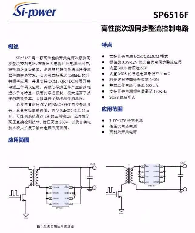 和PWM主控芯片搭配的是硅动力SP6516F次级同步整流芯片,内置耐压60V的NMOSFET同步整流开关,且具有极低的内阻,典型RdsON低至11mΩ,可提供系统高达3A的应用输出,工作电压范围宽,支持多种工作模式,应用方便。