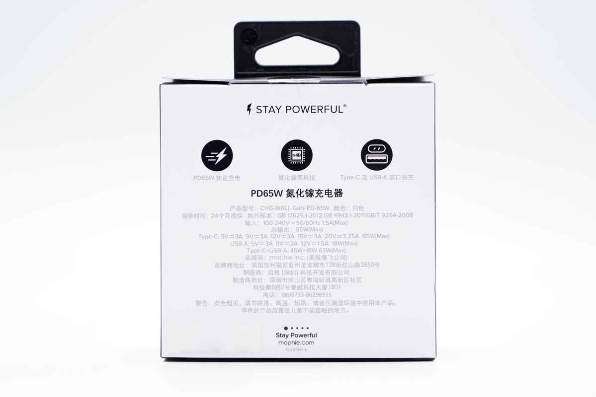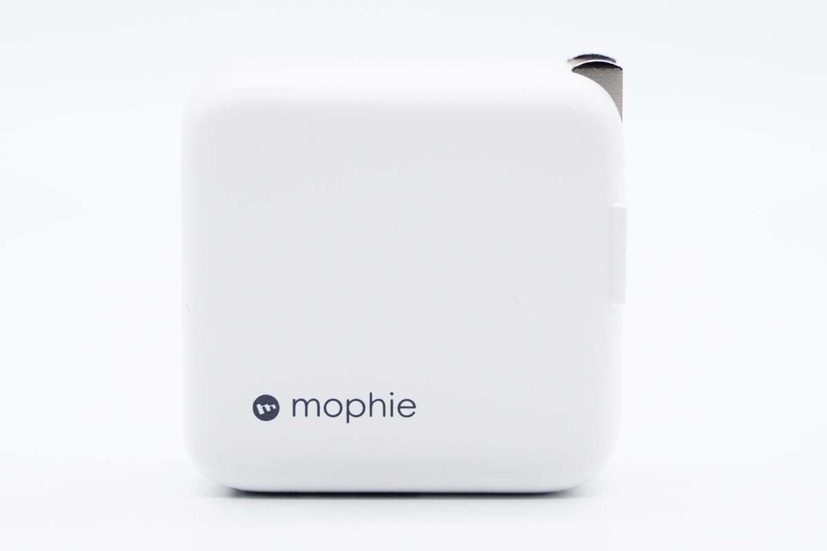 充电器采用PC阻燃材质白色外壳,表面全部磨砂处理,机身边角过渡圆润,正面印有mophie品牌logo,整体设计风格非常简约。