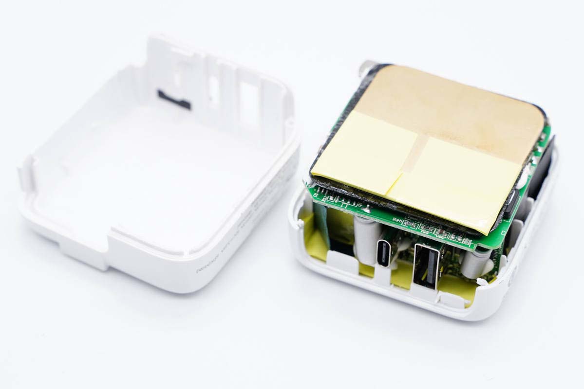 充电头网通过拆解了解到,PCB板正背面大量打胶,同时覆盖大面积散热片,以提高产品整体稳定性和散热性能。输入输出端均设有小板,可以充分利用内部空间,进而减小充电器体积。产品采用了时下热门的开关电源加二次加压架构。