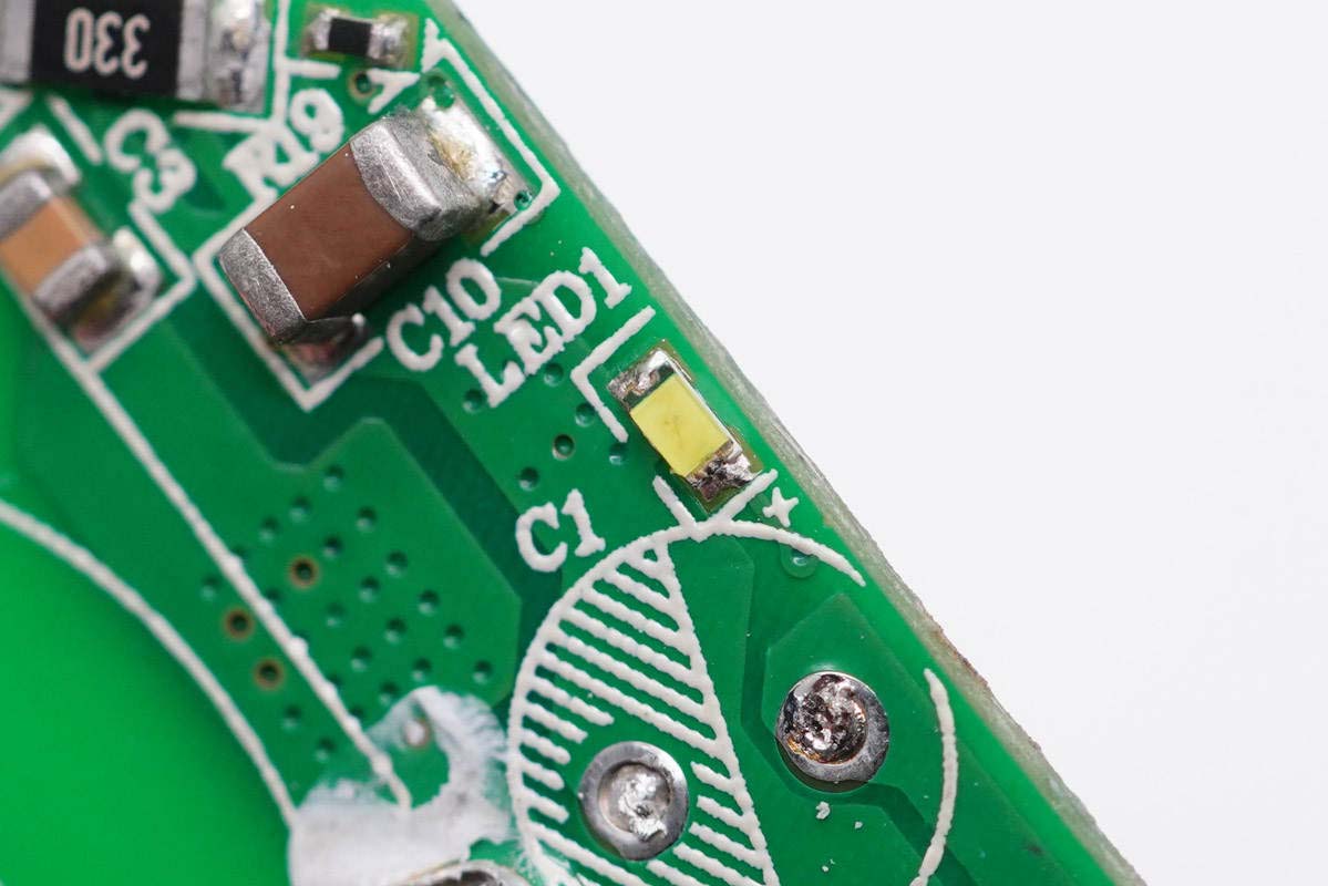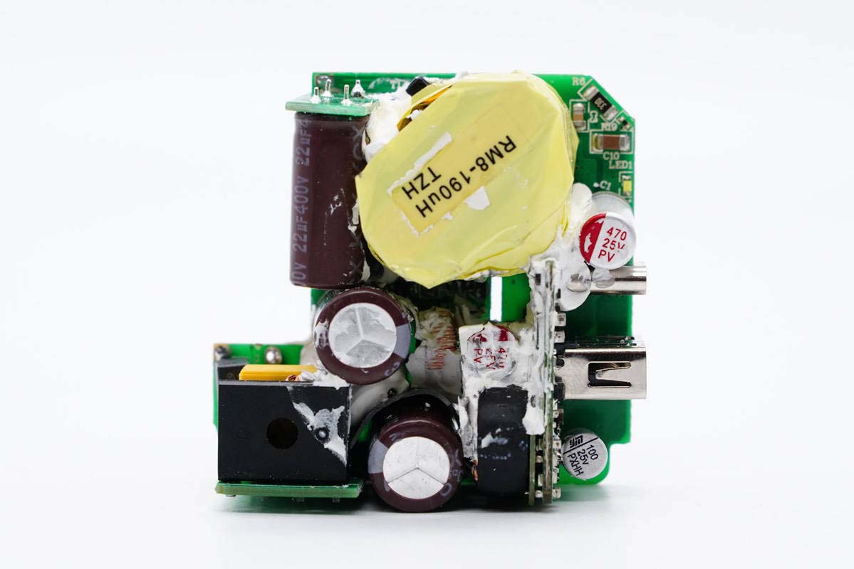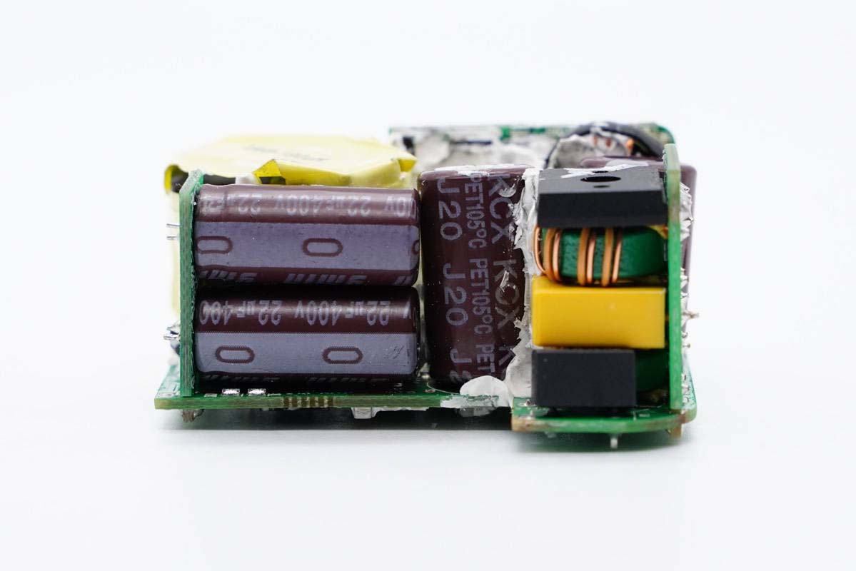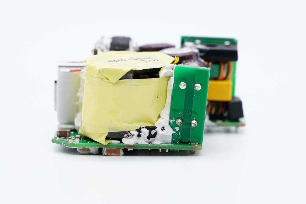 充电器输入端设有小板以增加空间利用率,左侧两颗高压滤波电解电容焊接在小板上。